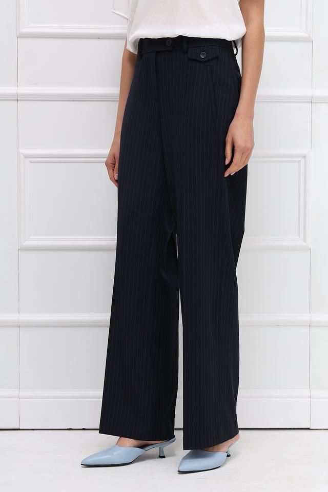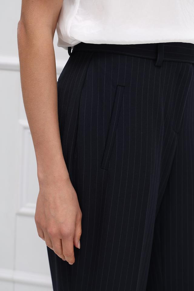 Классические брюки MORE and MORE темно-синего цвета в тонкую полоску. Изготовлены из переработанного полиэстера с добавлением вискозы и эластана, обеспечивающих комфорт и свободу движений. Состав: переработ.полиэстер 63%, вискоза 32%, эластан 5%