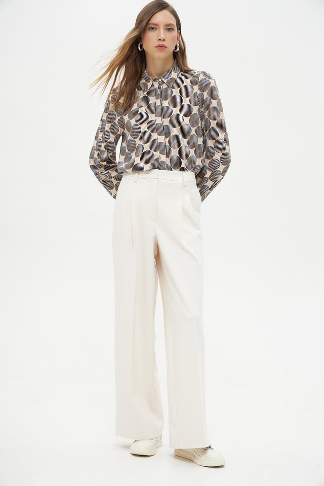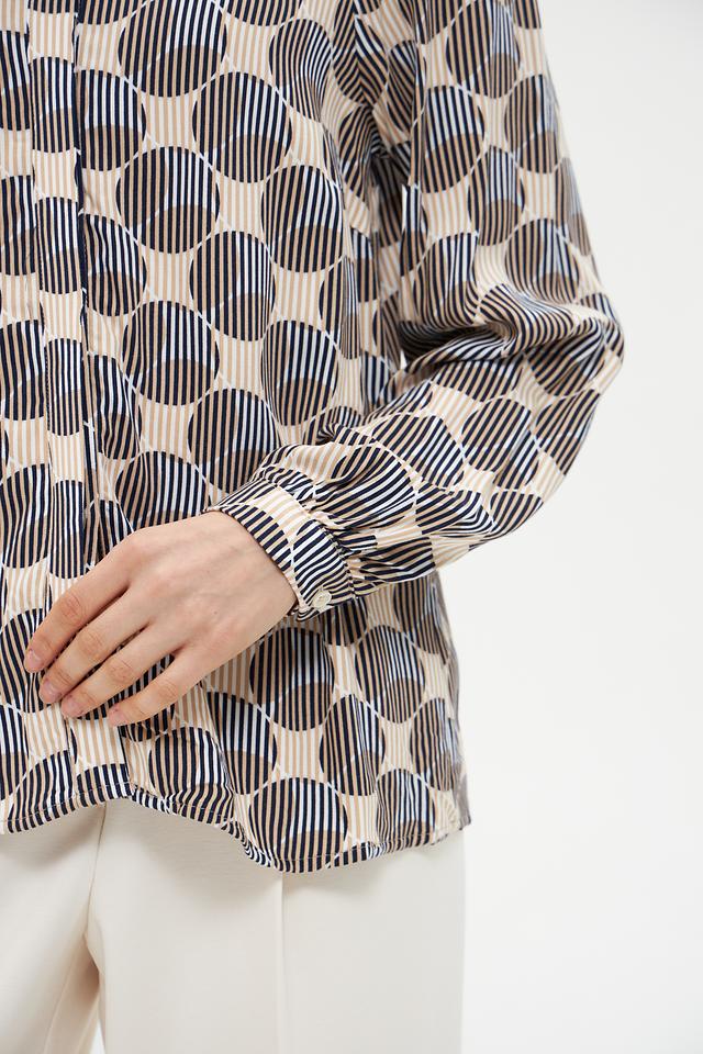 Особенностью модели является оригинальный геометрический принт, сочетающий в себе оттенки бежевого, кремового и тёмно-синего. Воротник-стойка с завязками добавляет изысканности, а рукава с манжетами и небольшими сборками придают блузке лёгкость и воздушность.