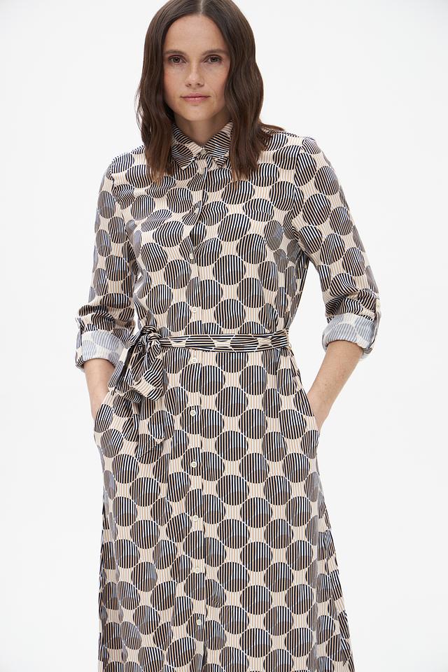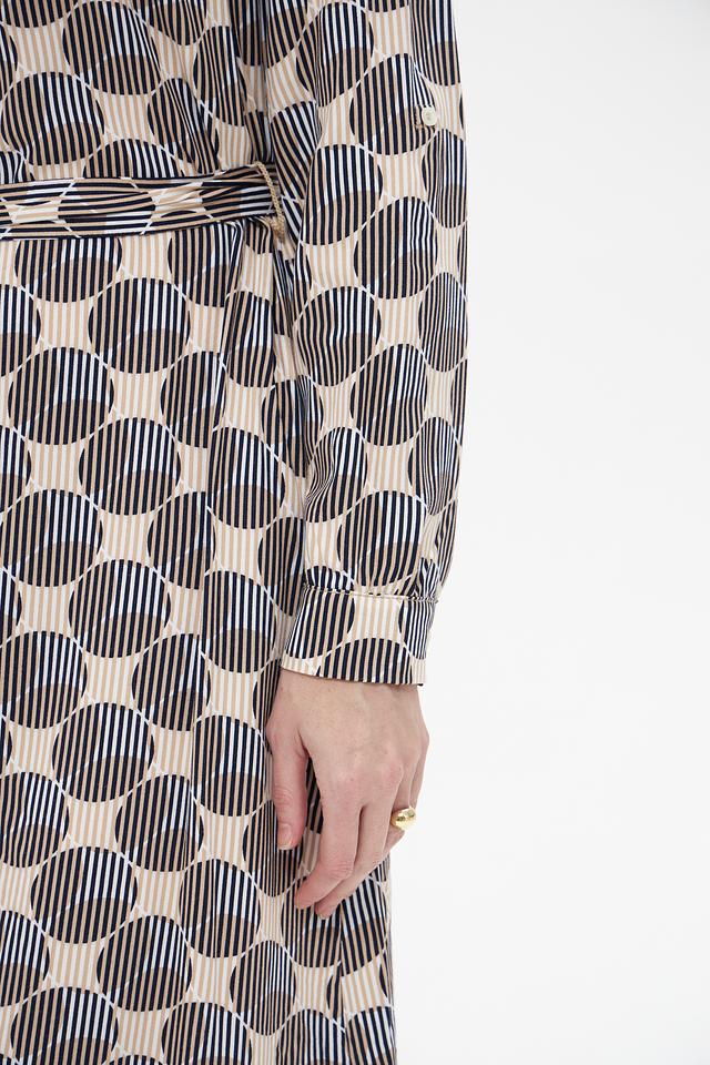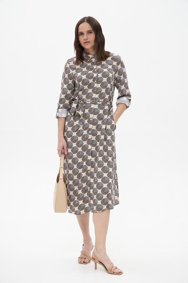 Платье More and More бежевого цвета с оригинальным геометрическим принтом – стильное и комфортное решение для повседневного образа. Модель выполнена из мягкой вискозы и имеет удобный пояс. Состав: вискоза (EcoVero) 100%