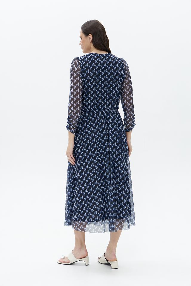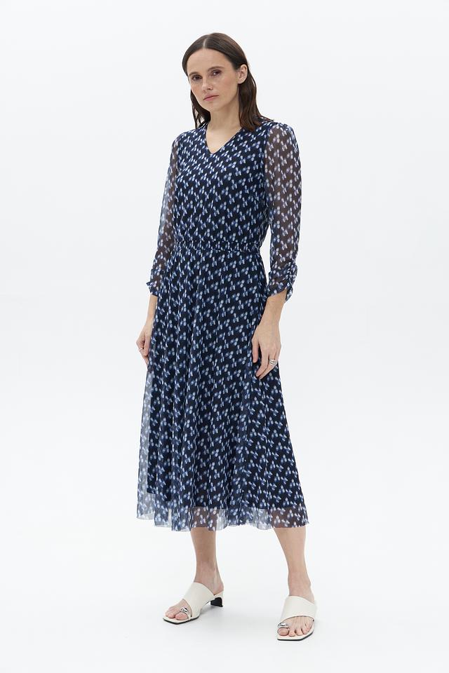 Платье имеет V-образный вырез, короткие рукава из полупрозрачной ткани и приталенный силуэт с эластичной резинкой на талии. Плиссированная юбка придает платью легкость и динамичность. Длина платья – миди, что делает его универсальным для различных случаев.