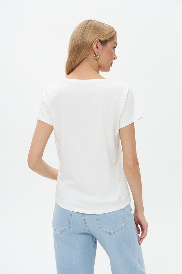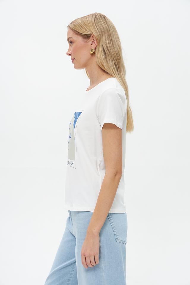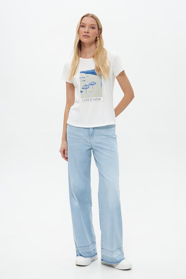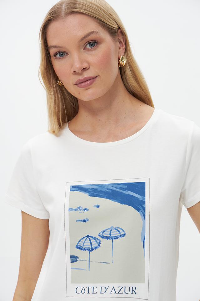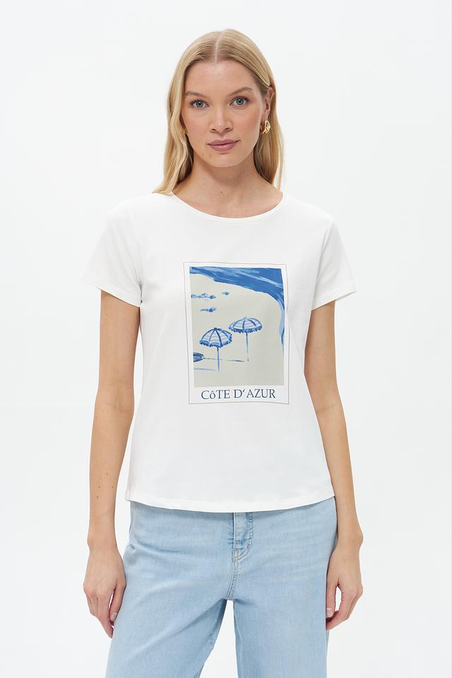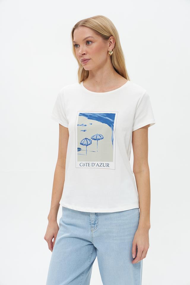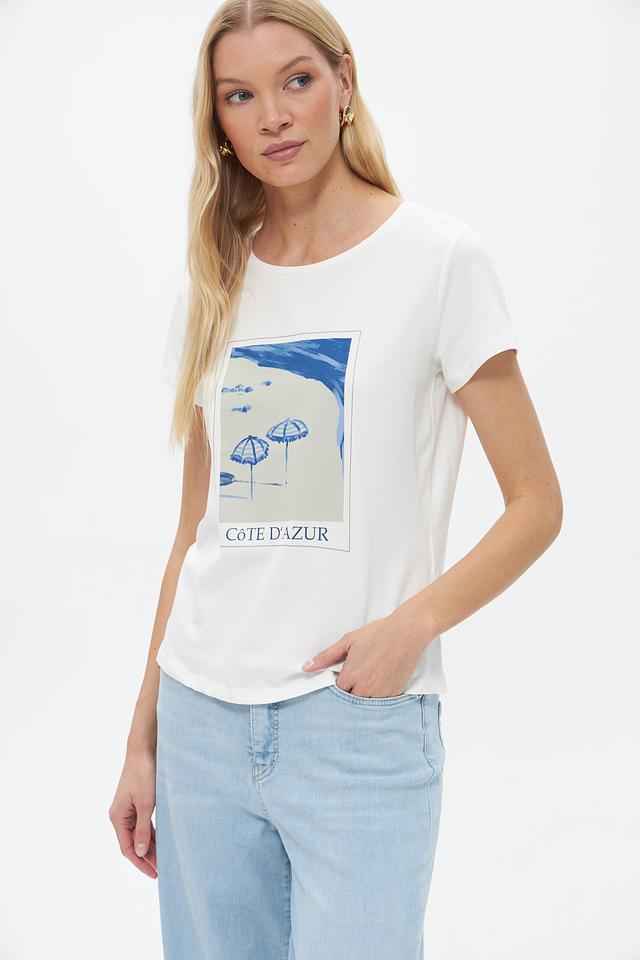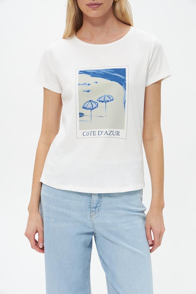 Эта стильная футболка от бренда More and More выполнена в белом цвете и украшена эффектным принтом с изображением пляжного пейзажа и надписью "Côte d'Azur".