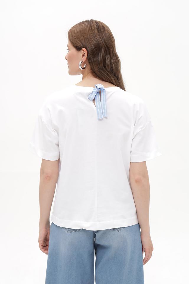 Блузка имеет свободный крой, который обеспечивает комфортную посадку по фигуре. Короткие рукава и круглый вырез делают ее идеальной для теплой погоды. Завязки на спине добавляют образу изящества и позволяют регулировать посадку.