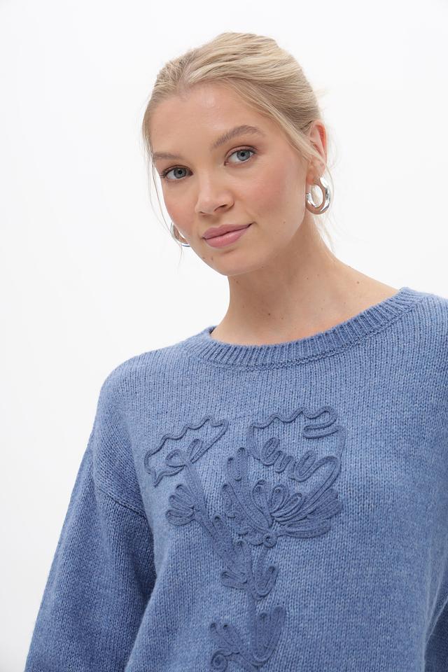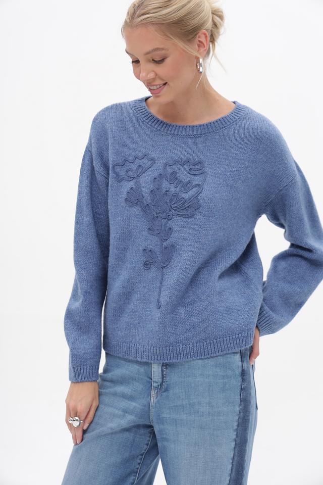 Особенности дизайна: пуловер украшен вышивкой в виде стилизованного цветочного мотива, расположенного на лицевой стороне. Вырез горловины – круглый. Рукава – длинные. Крой – свободный, не сковывающий движения.
