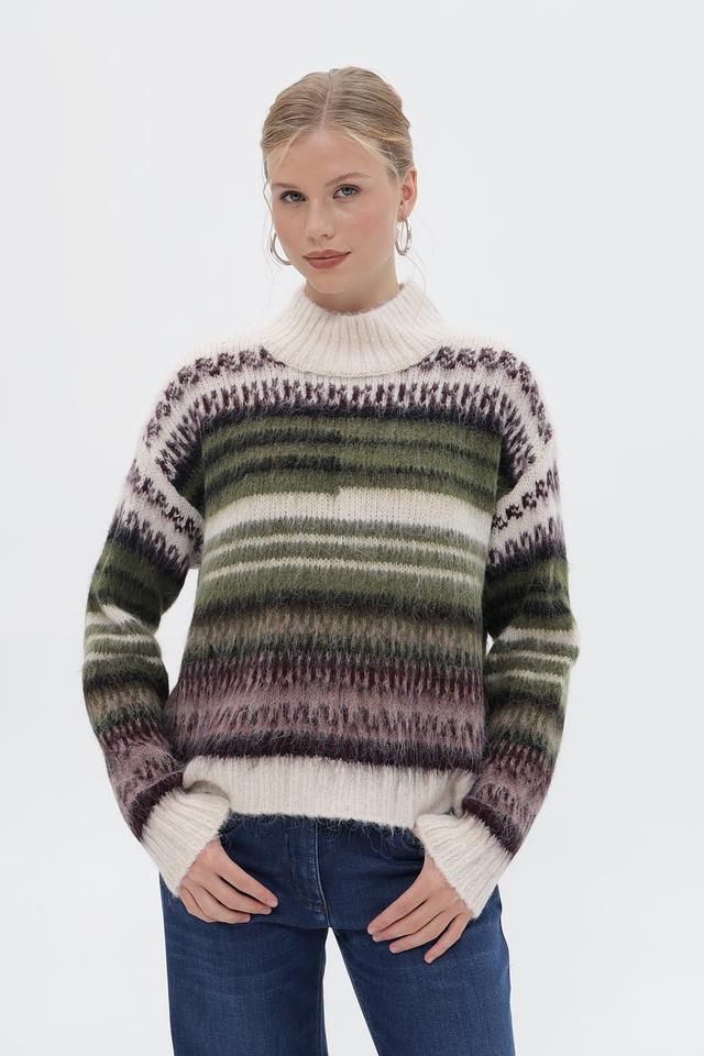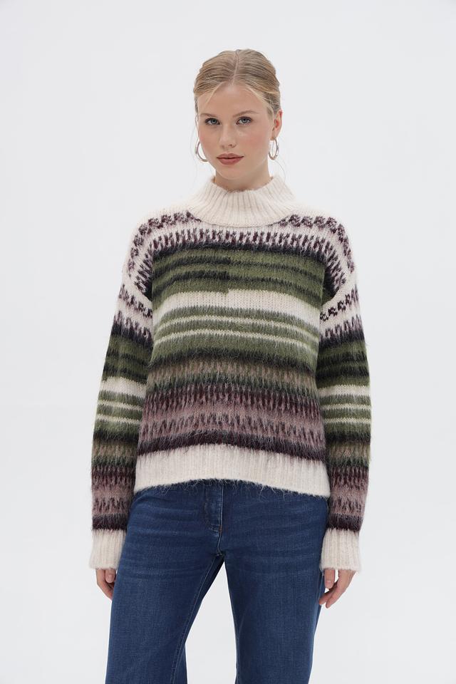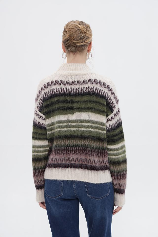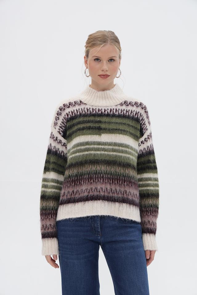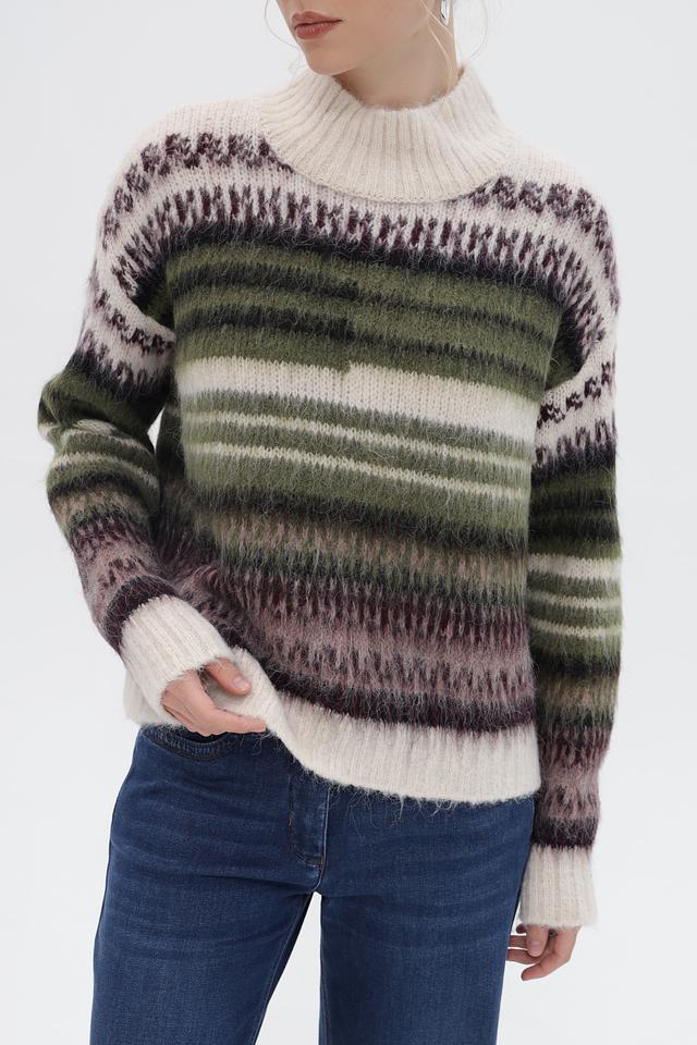 Основным акцентом пуловера является яркий полосатый узор, сочетающий в себе оттенки зелёного, коричневого и фиолетового. Такой принт добавит динамики и оригинальности вашему образу.