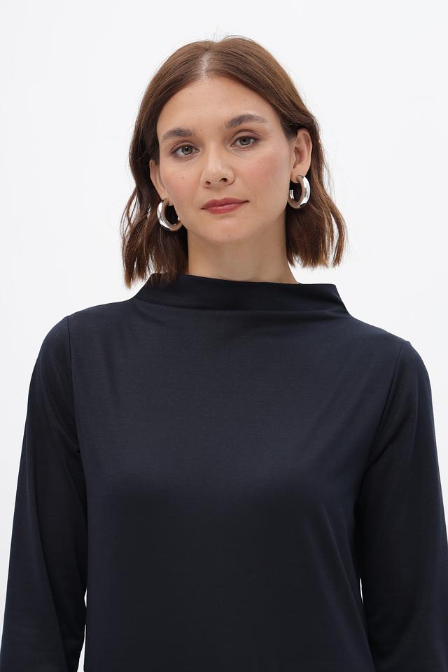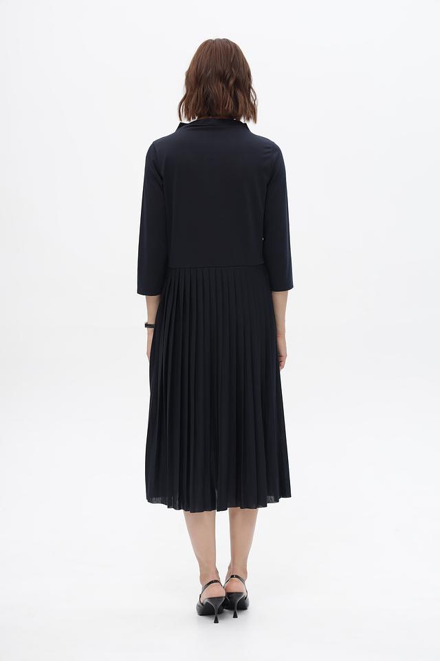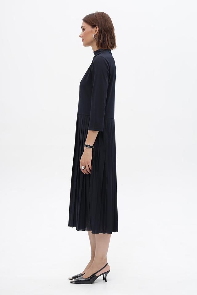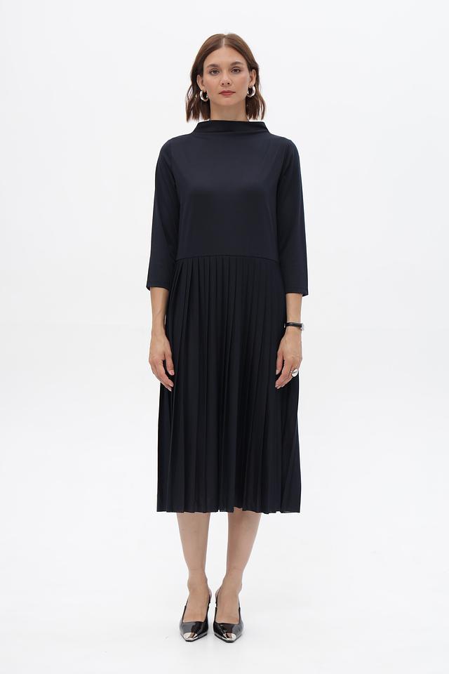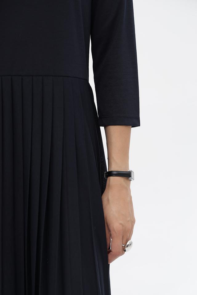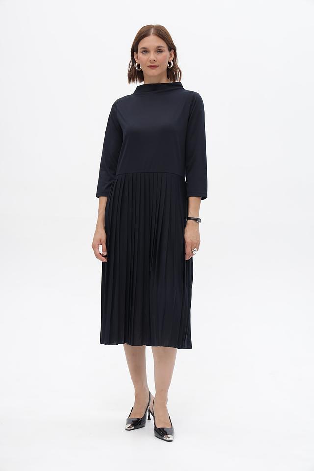 Платье от MORE and MORE выполнено в тёмно-синем цвете и имеет приталенный силуэт. Верх платья выполнен из гладкой ткани, а юбка – из плиссированного материала, что придает модели динамичный и женственный вид.
