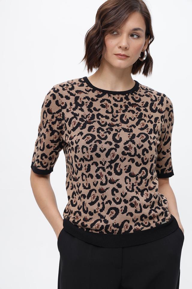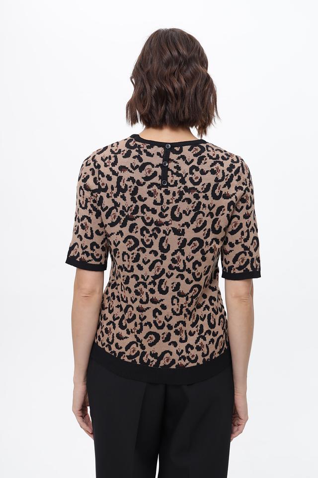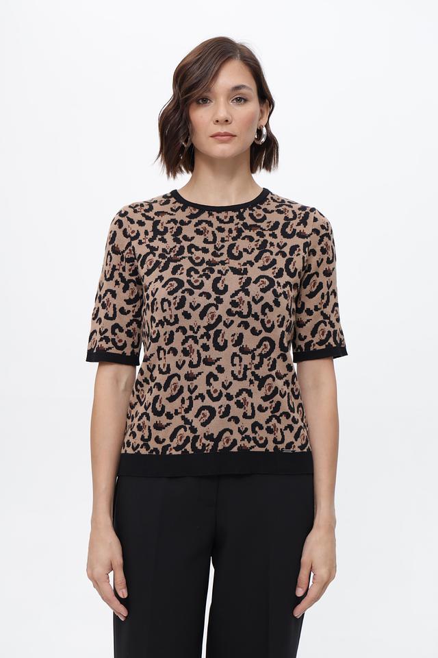 Бежевый пуловер More and More с короткими рукавами и принтом «леопард» выполнен из мягкой вискозы с добавлением полиамида. Удобная модель для создания повседневных образов. Состав: вискоза 83%, полиамид 17%