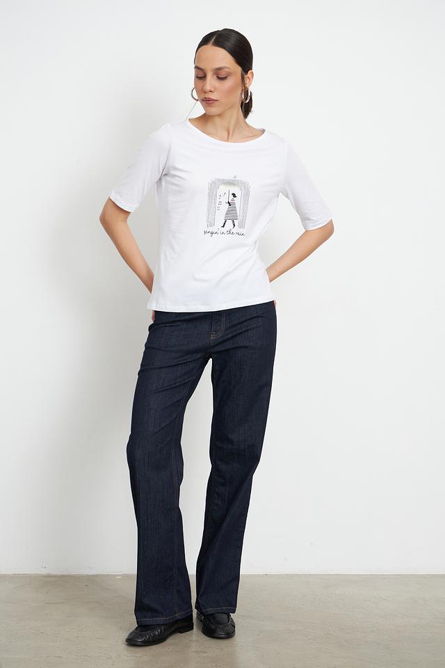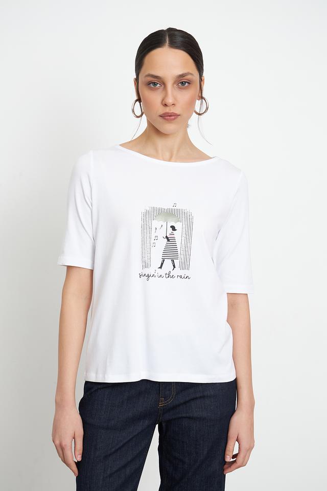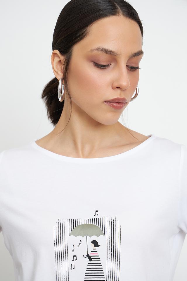 Особенностью данной модели является оригинальный принт с изображением девушки с зонтом, выполненный в графичном стиле. Футболка имеет круглый вырез горловины и короткие рукава, что делает ее идеальной для теплой погоды.