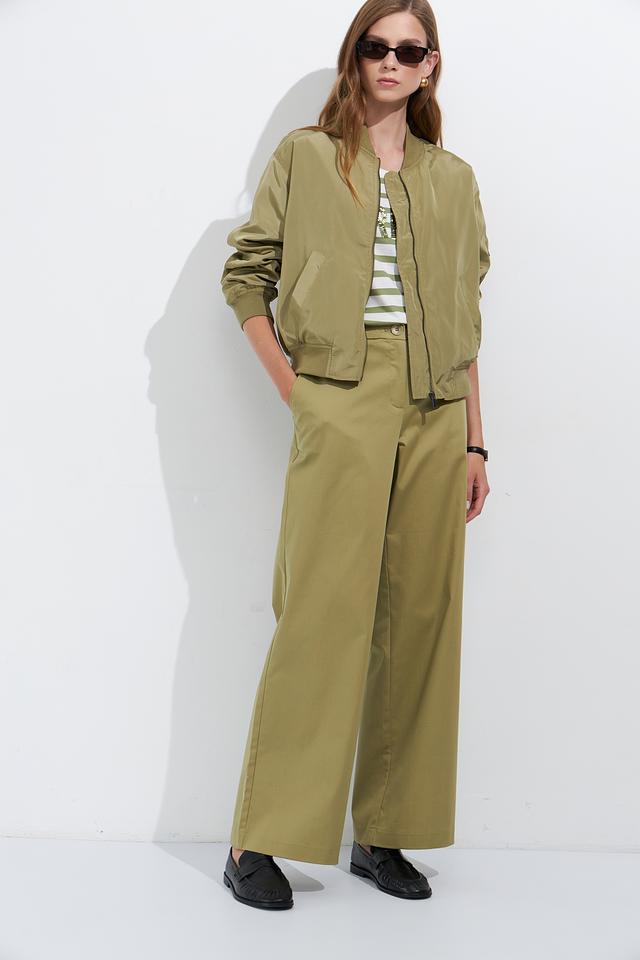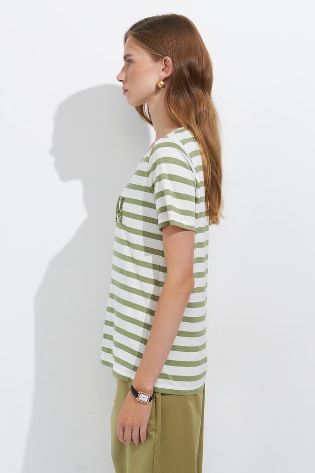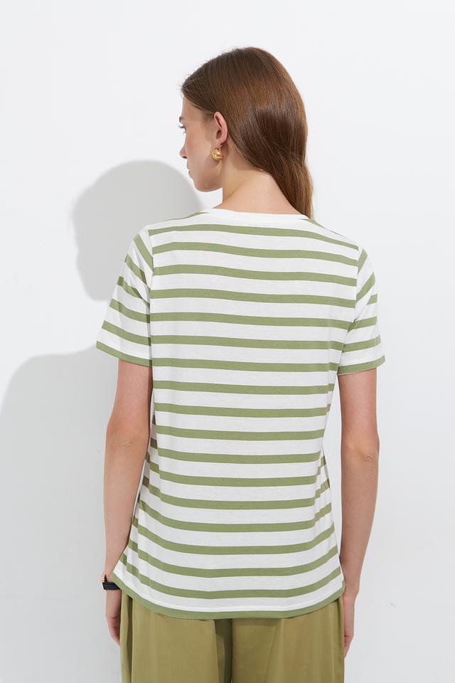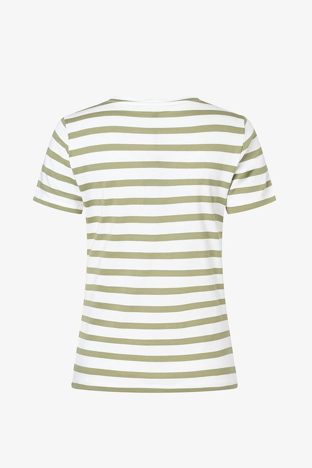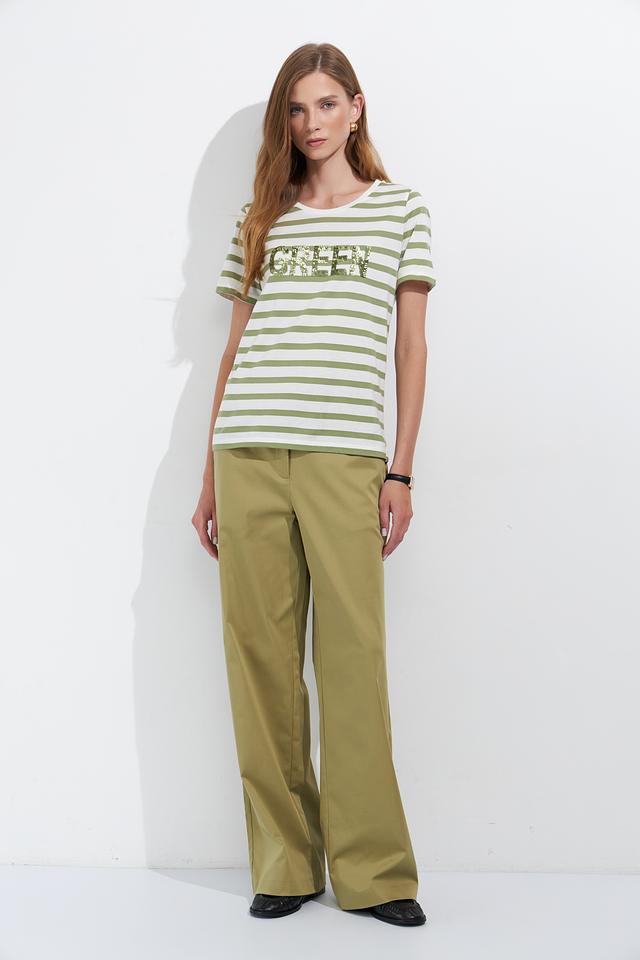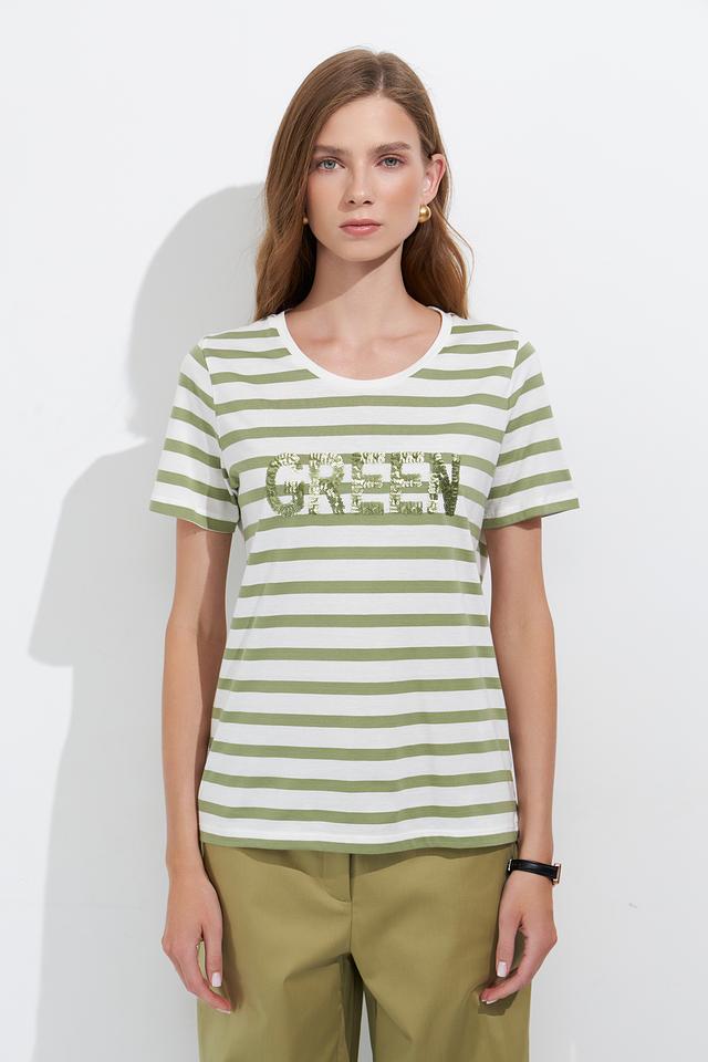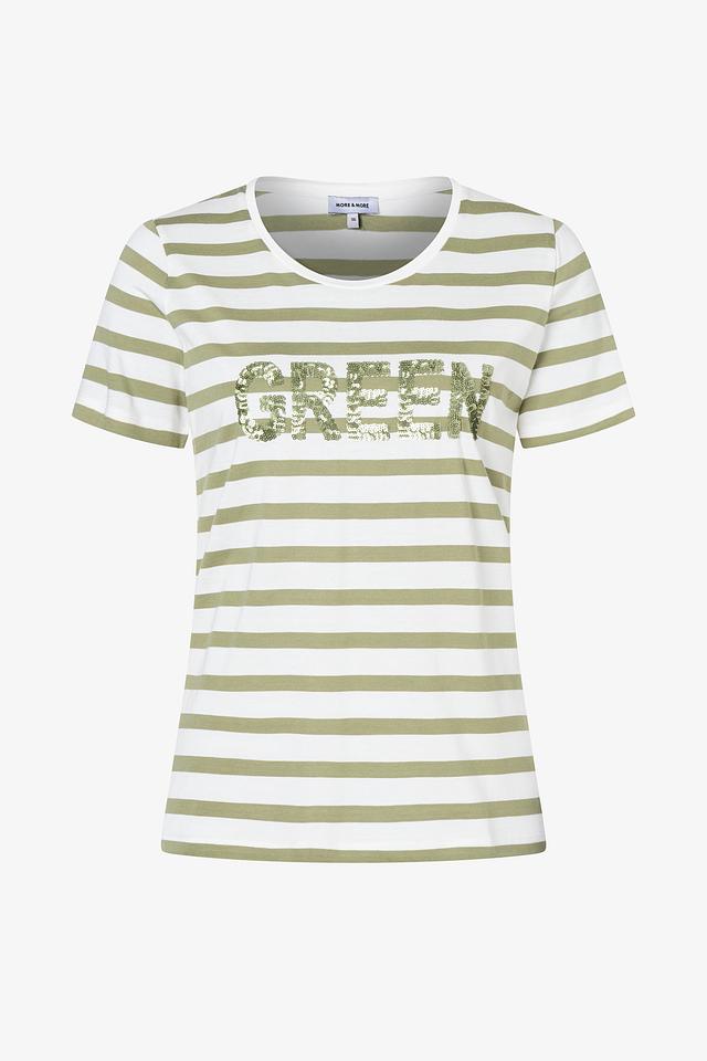 Эта стильная футболка от MORE and MORE выполнена в классическом крое с короткими рукавами. Основной цвет футболки – белый, дополненный широкими полосами оливкового и светло-зеленого оттенков.