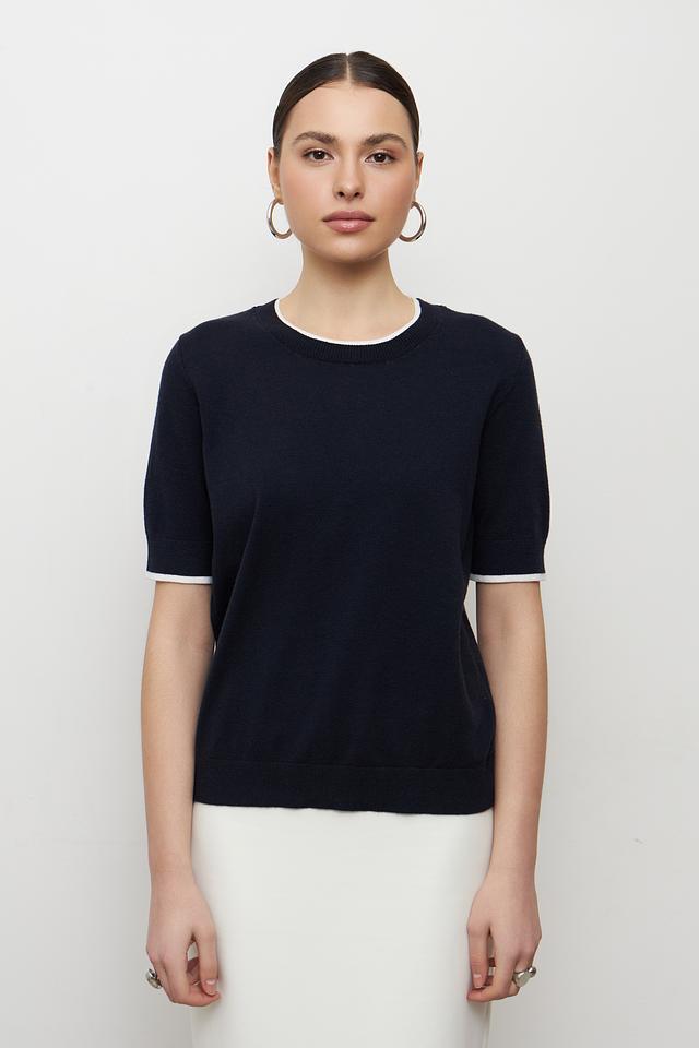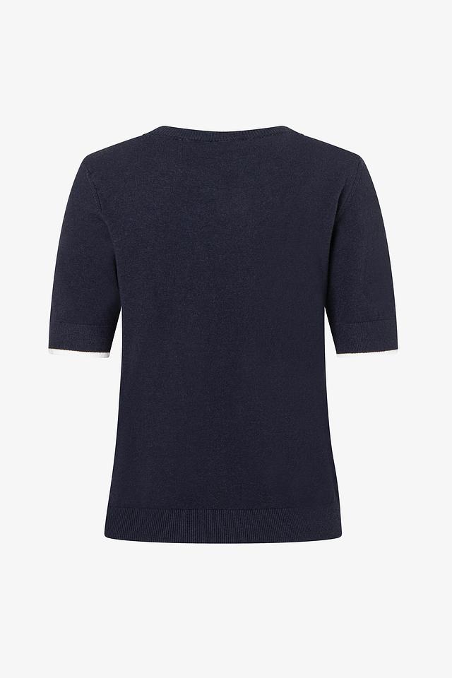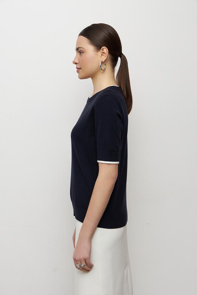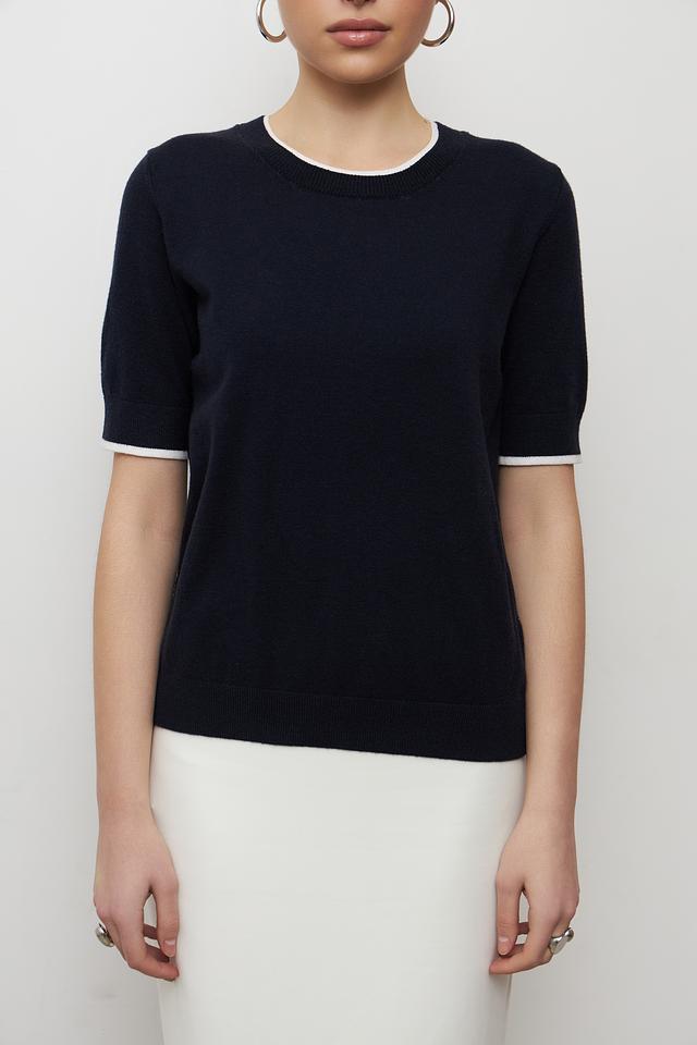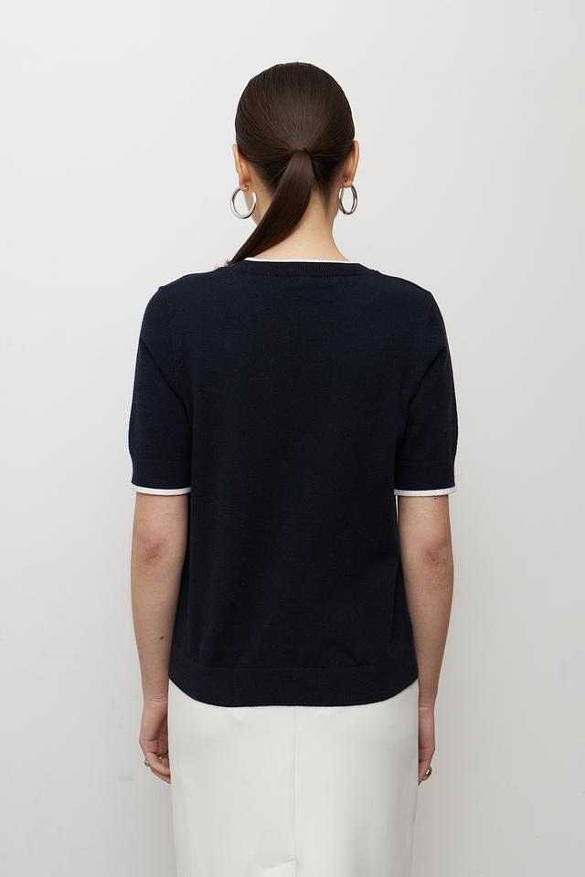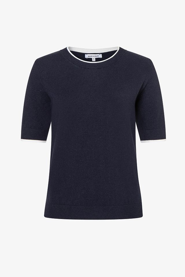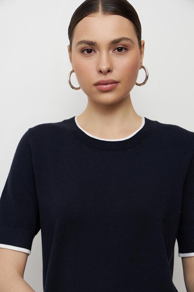 Женский пуловер MORE and MORE темно-синего цвета с короткой посадкой и белой полоской на горловине и рукавах. Изготовлен из мягкого трикотажа, идеально подходит для создания повседневных образов. Состав: вискоза 50%, полиэстер 28%, полиамид 22%