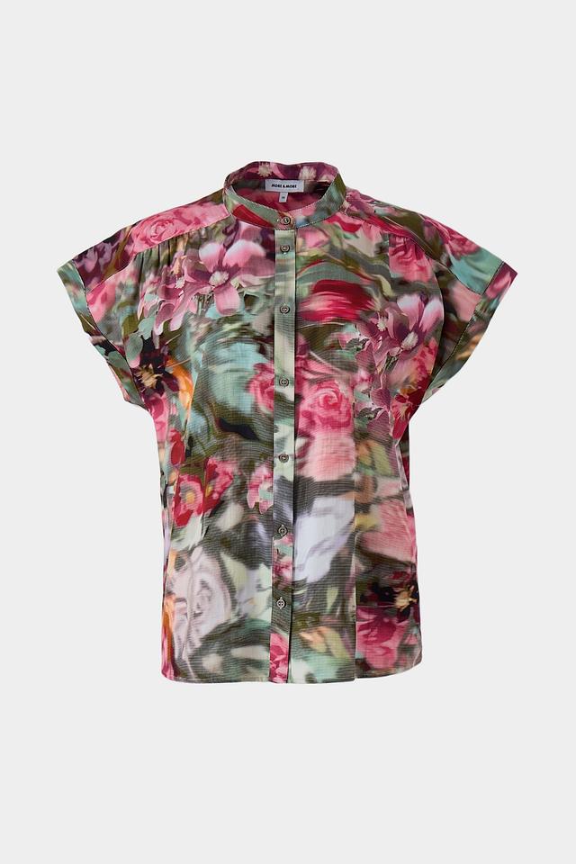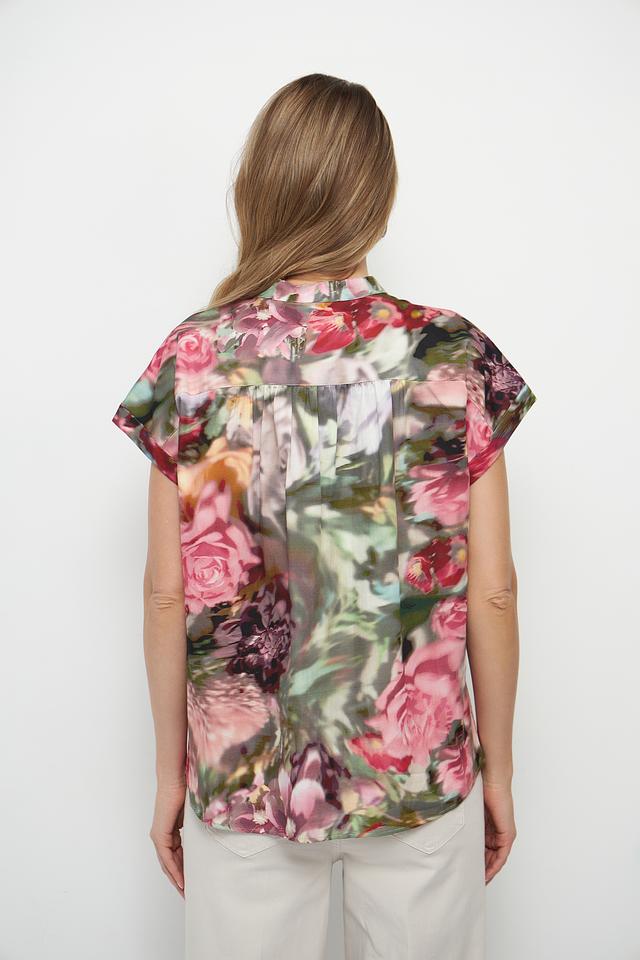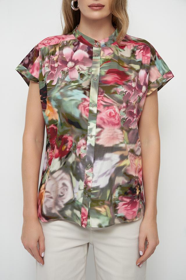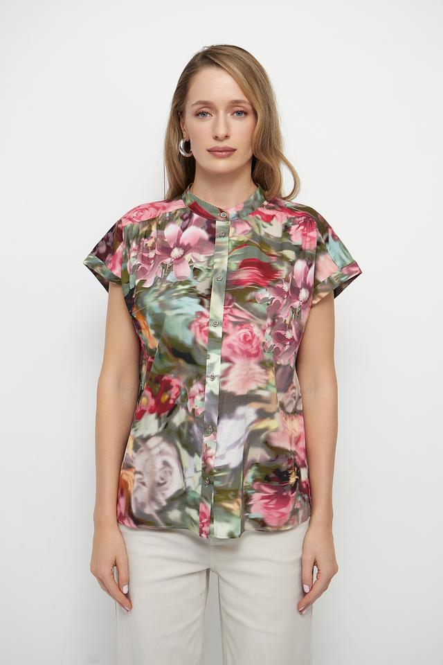 Блуза имеет свободный крой, короткий рукав и воротник-стойку. Застежка на пуговицы позволяет регулировать степень прилегания. Особенностью модели является эффектный цветочный принт, который делает ее уникальной и привлекательной.