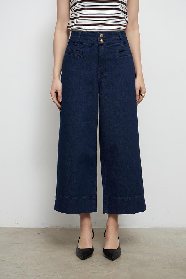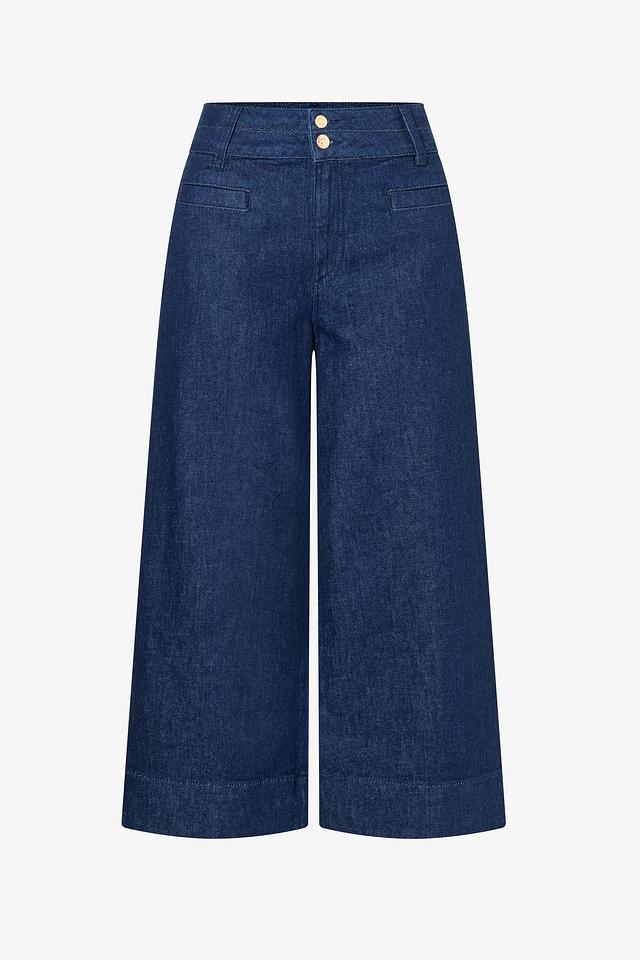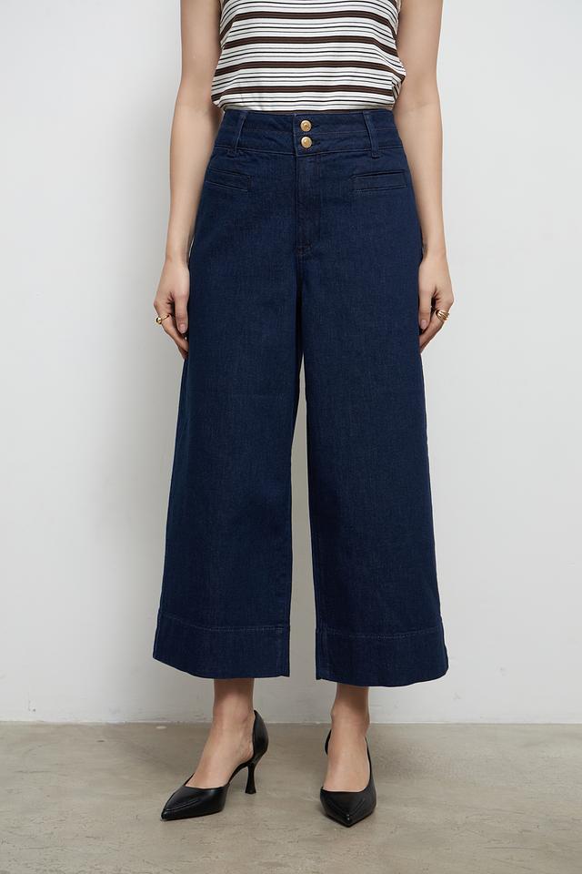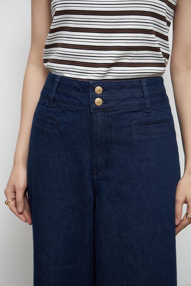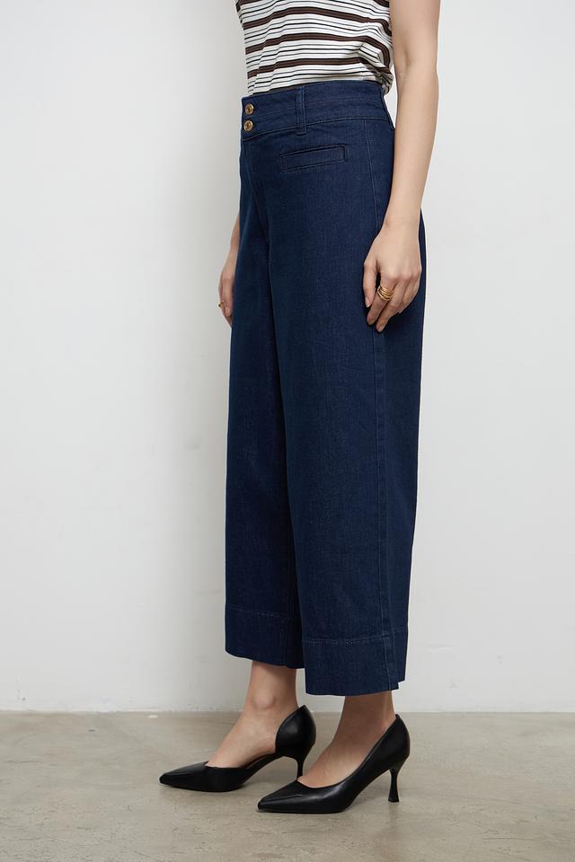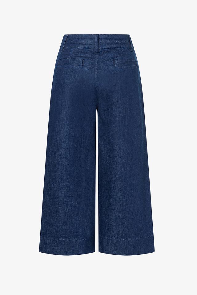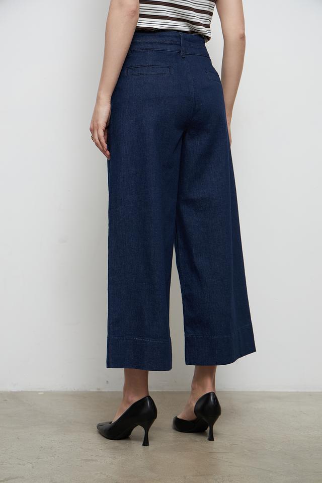 Брюки имеют широкий крой, который обеспечивает свободу движений и создает элегантный силуэт. Высокая посадка подчеркивает талию и визуально удлиняет ноги. Застежка на пуговицы и молнию обеспечивает надежную фиксацию. Классический синий цвет легко сочетается с различными элементами гардероба, позволяя создавать разнообразные комплекты.
