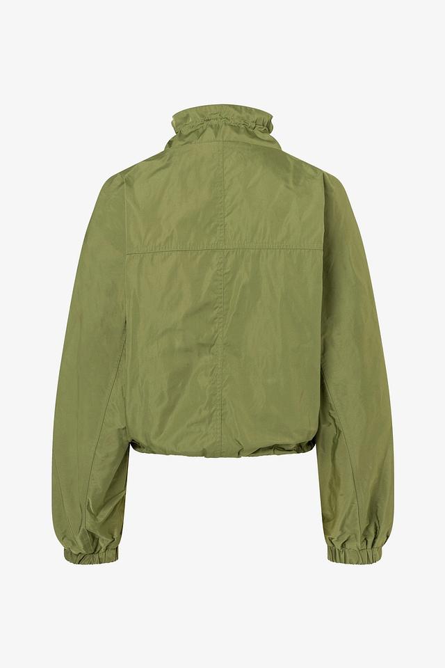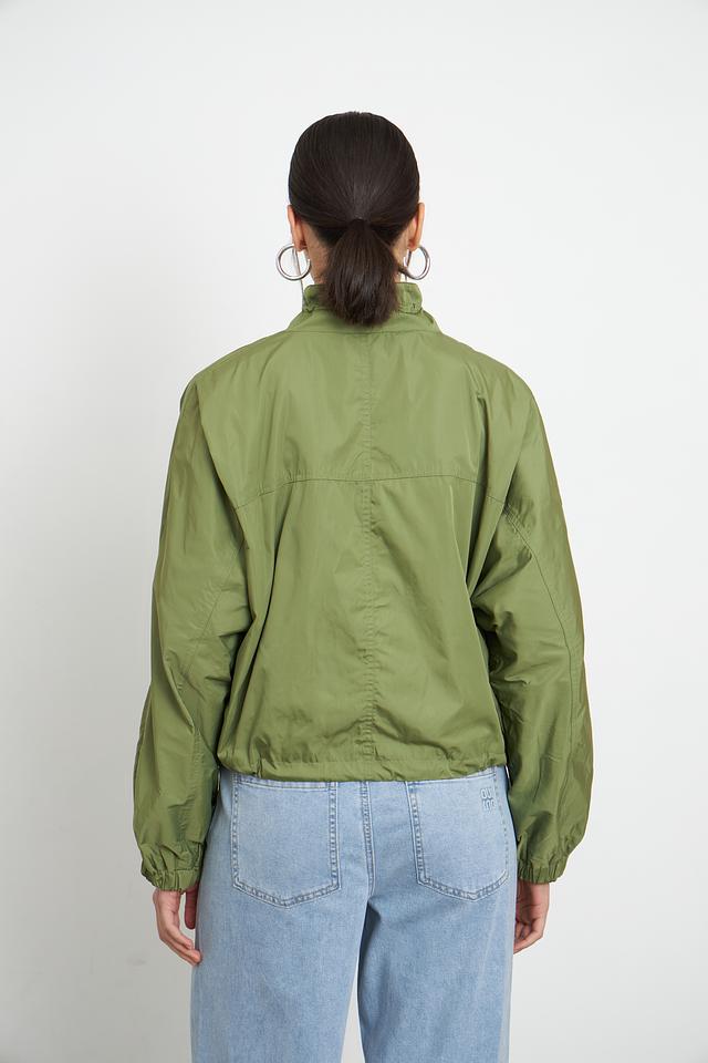 Куртка застегивается на молнию, а воротник-стойка дополнен кулиской с фиксаторами. Рукава куртки широкие, с манжетами на резинке, что позволяет регулировать их длину и посадку. По низу куртки также предусмотрена резинка, создающая слегка присобранный силуэт.