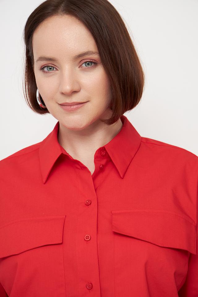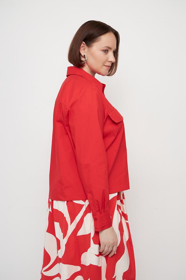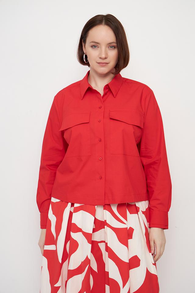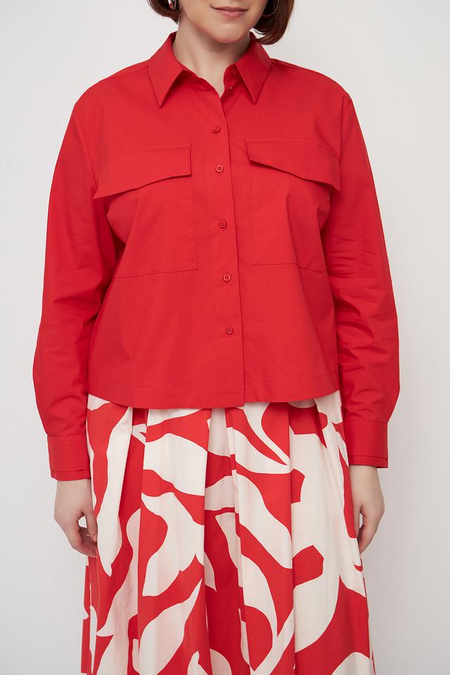 Блуза имеет прямой крой, который обеспечивает свободу движений и комфортную посадку по фигуре. Короткие рукава и классический отложной воротник придают ей элегантный вид. Накладные карманы добавляют функциональности и стиля.