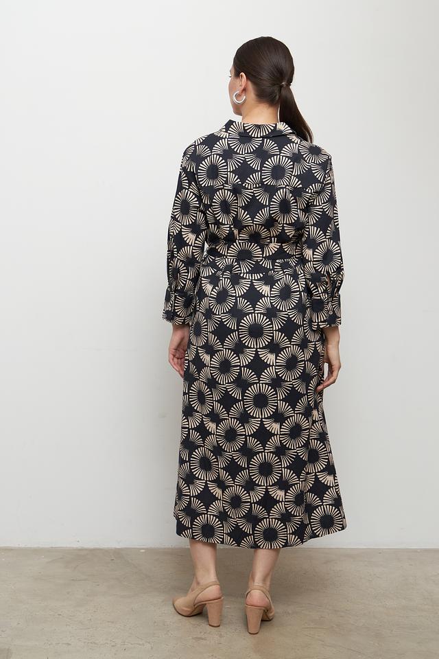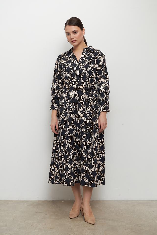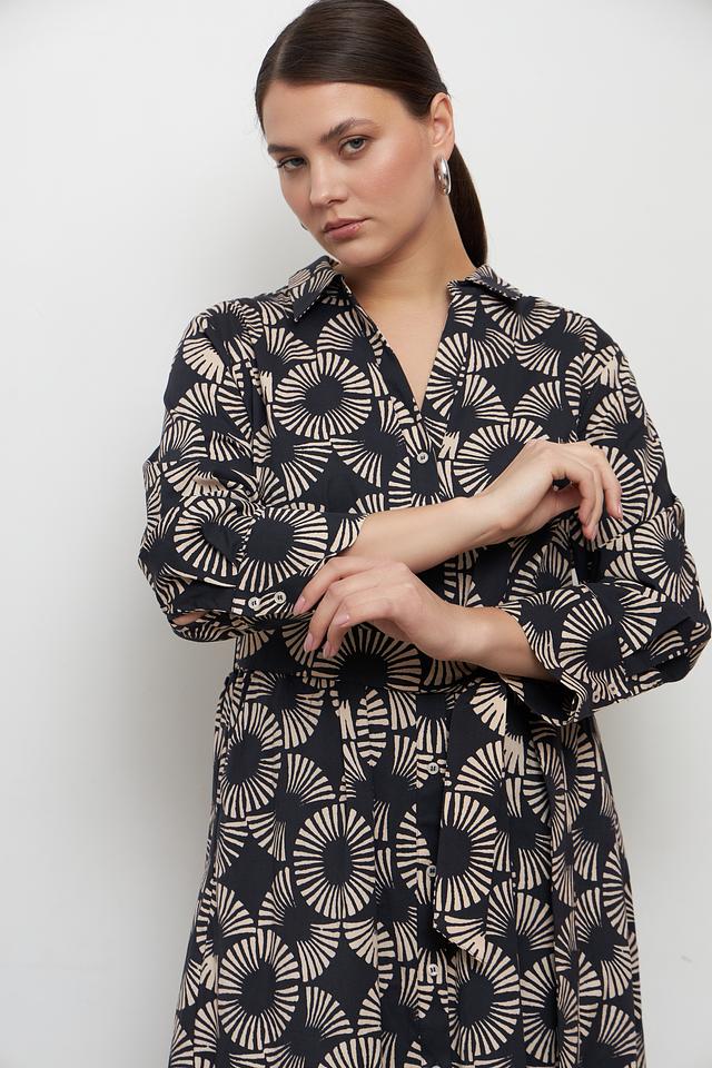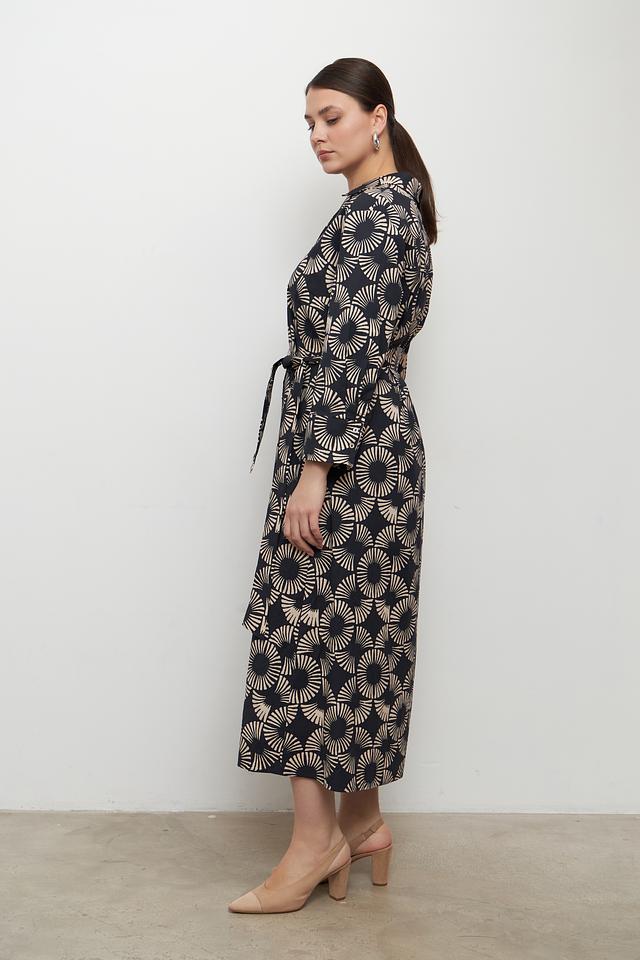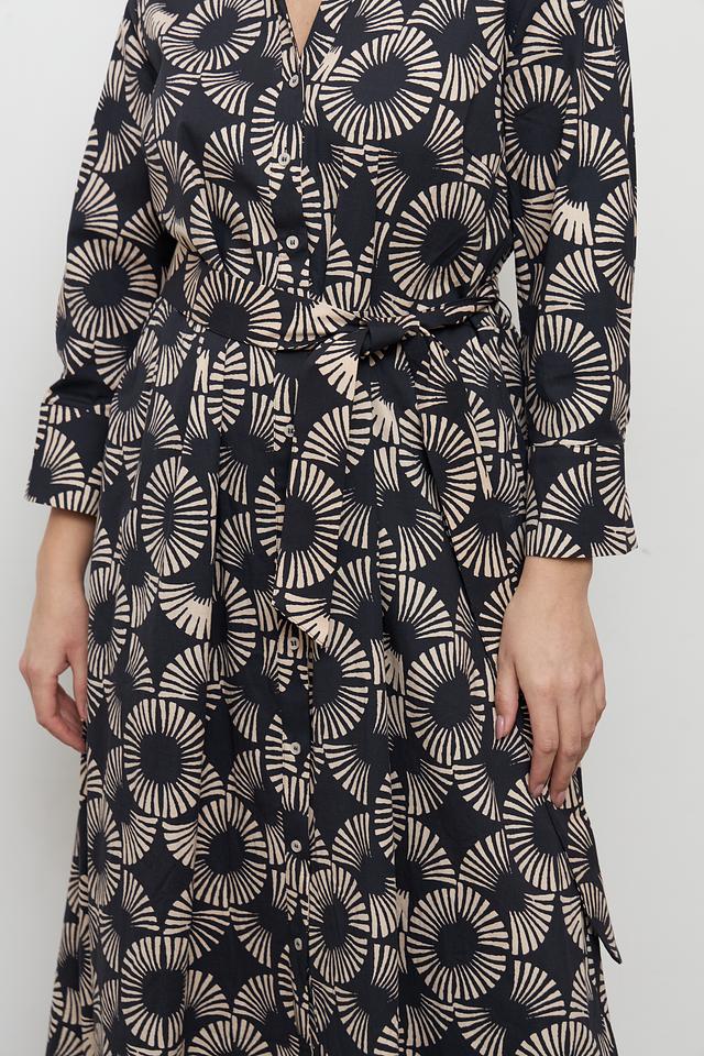 Особенностью этого платья является яркий и необычный принт в бежевых тонах на черном фоне. Такой рисунок делает платье запоминающимся и привлекательным.