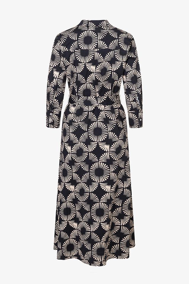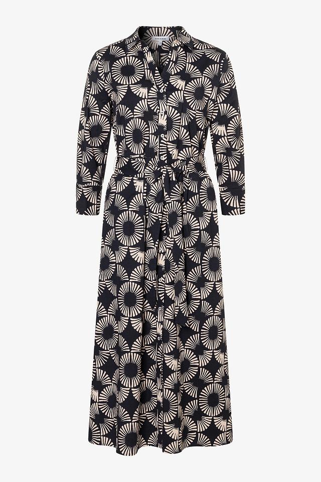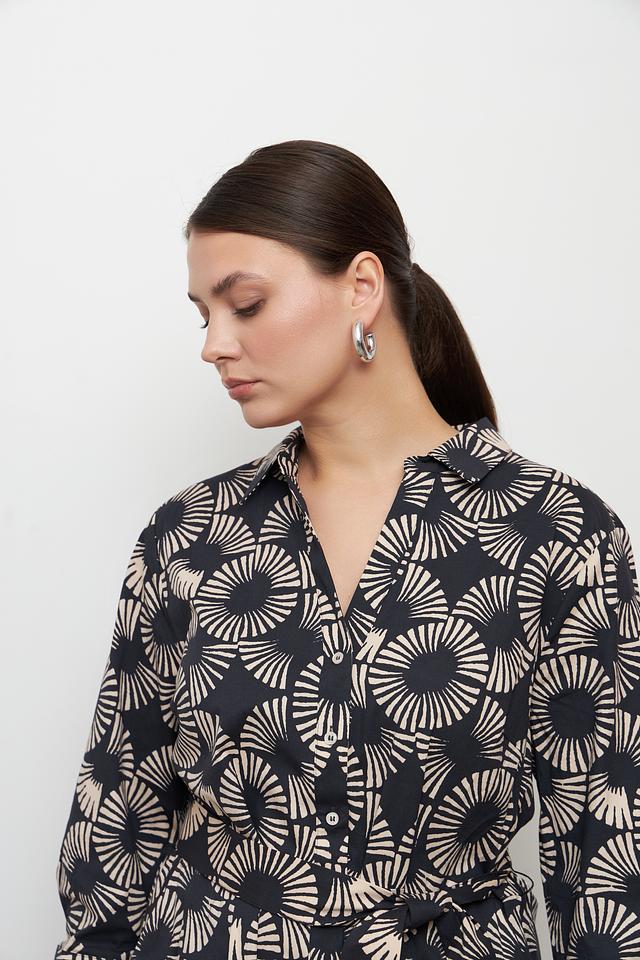 Платье MORE and MORE чёрного цвета с оригинальным бежевым принтом – стильное и комфортное решение для создания женственного образа. Модель с V-образным вырезом и поясом подчеркивает талию и создает элегантный силуэт. Состав: хлопок 97%, эластан 3%