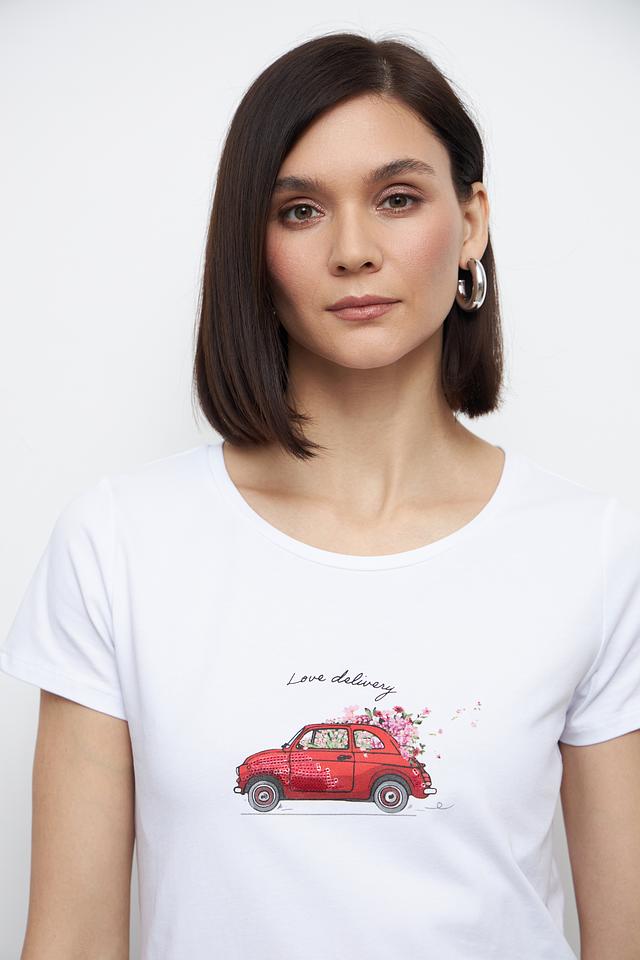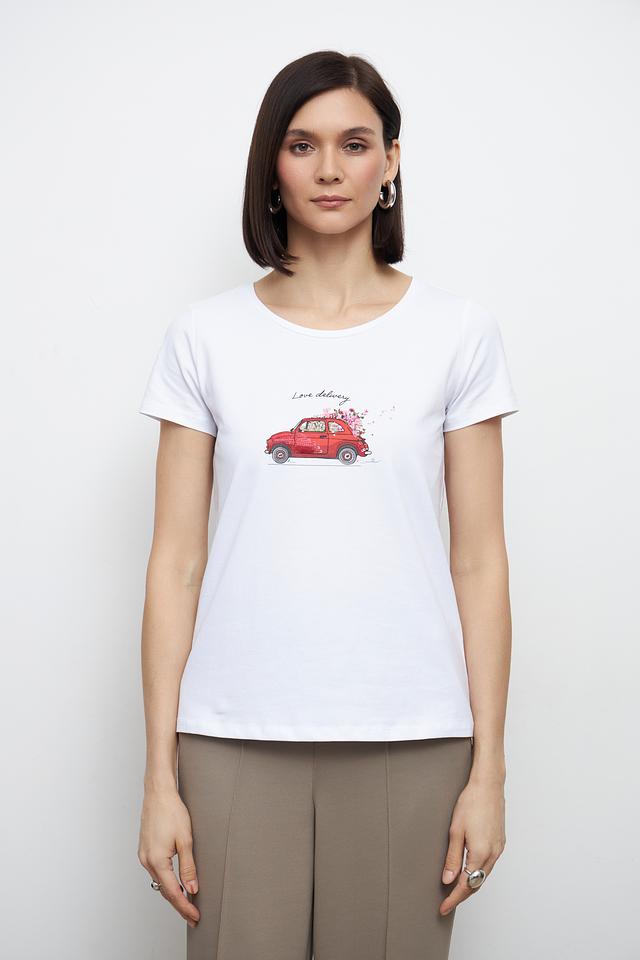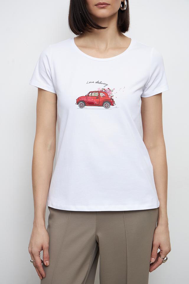 Особенностью данной модели является оригинальный принт с изображением красного автомобиля, который добавляет ей индивидуальности и привлекательности. Футболка имеет классический крой с круглым вырезом горловины и короткими рукавами.