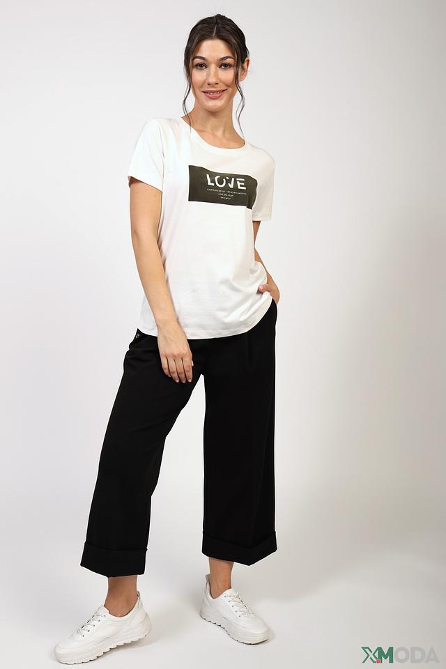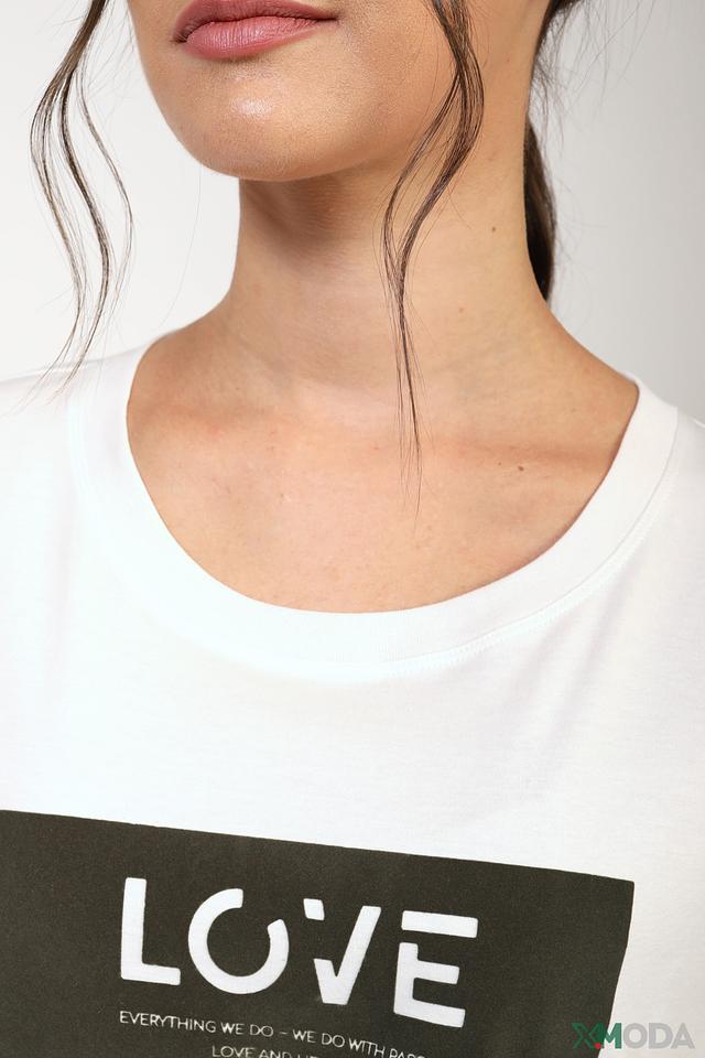 Особенностью этой модели является яркий принт LOVE, выполненный в контрастных чёрных тонах. Принт добавляет футболке оригинальности и выразительности.
