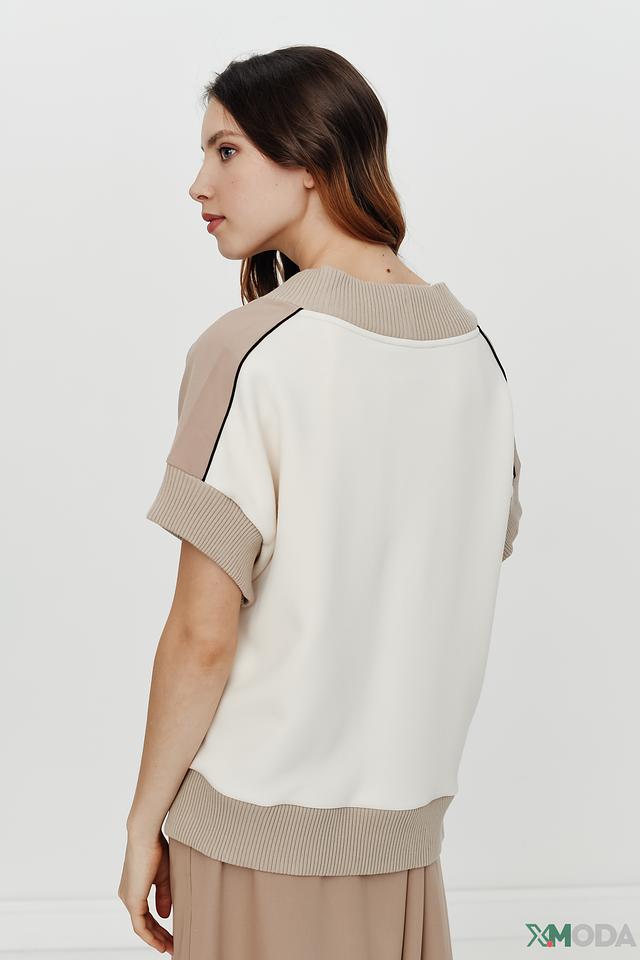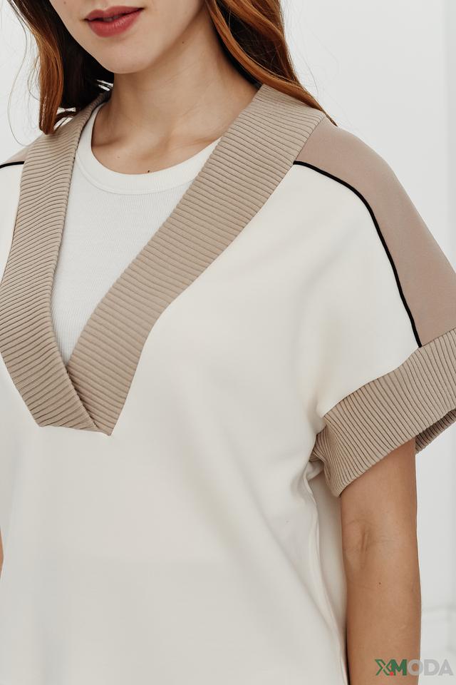 V-образный вырез подчеркивает линию шеи, а контрастная отделка добавляет образу выразительности. Жилет имеет короткие рукава и свободный крой, обеспечивающий комфорт в носке.