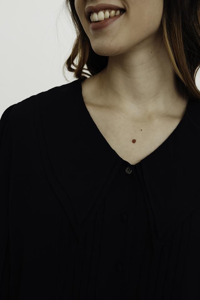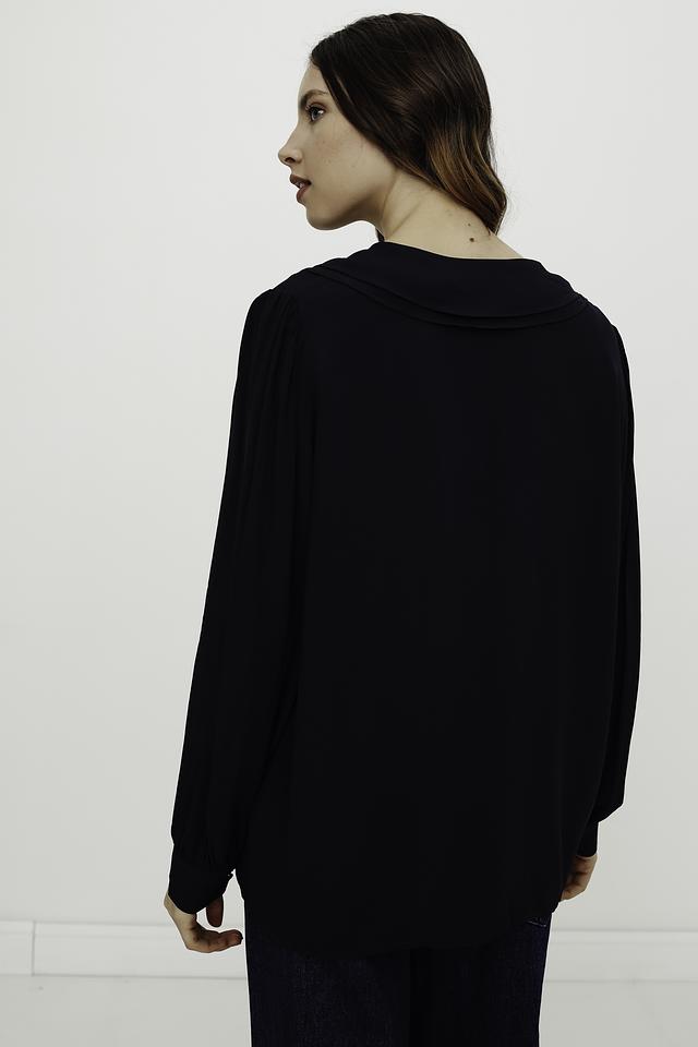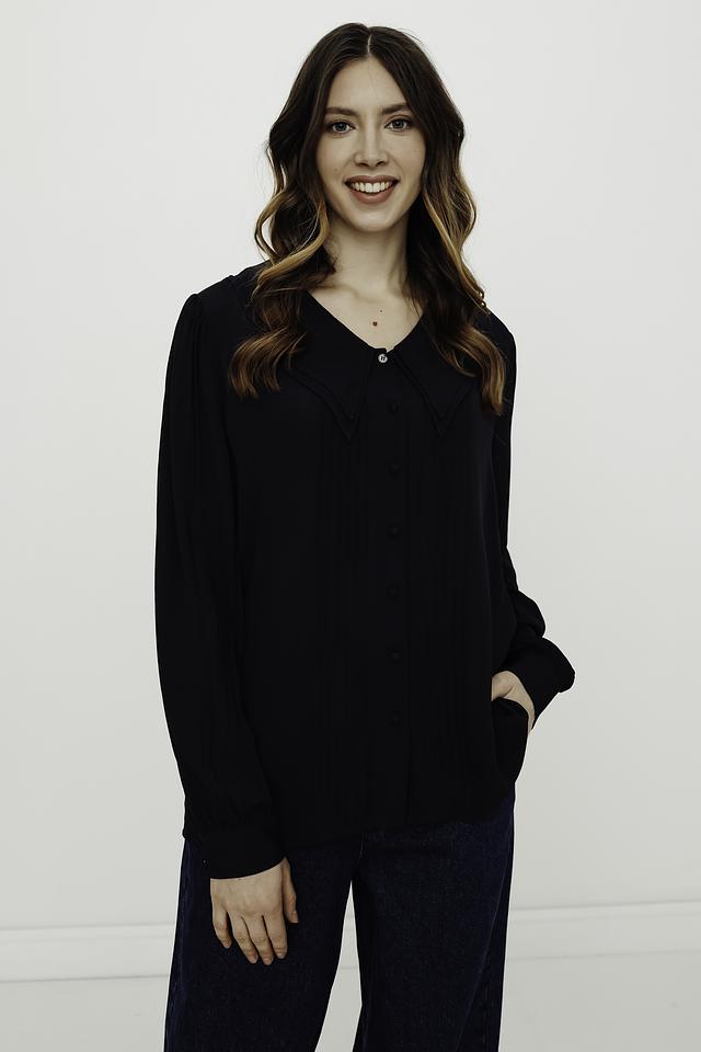 Блуза имеет длинные рукава с небольшими воланами на манжетах, которые добавляют образу женственности. V-образный вырез горловины и аккуратная планка с пуговицами создают элегантный силуэт. Декоративные складки на груди придают блузе дополнительный объём и текстуру.