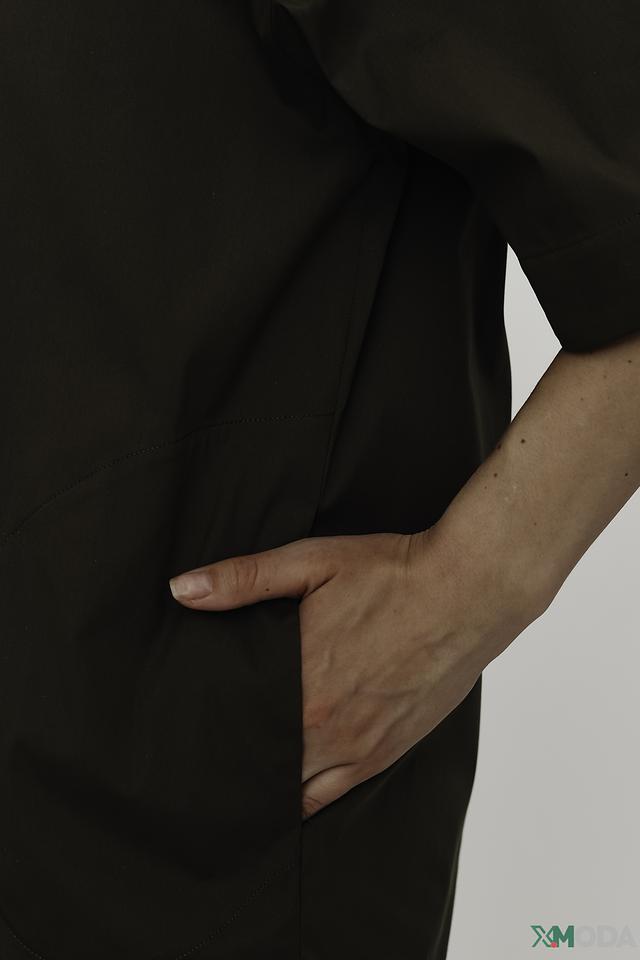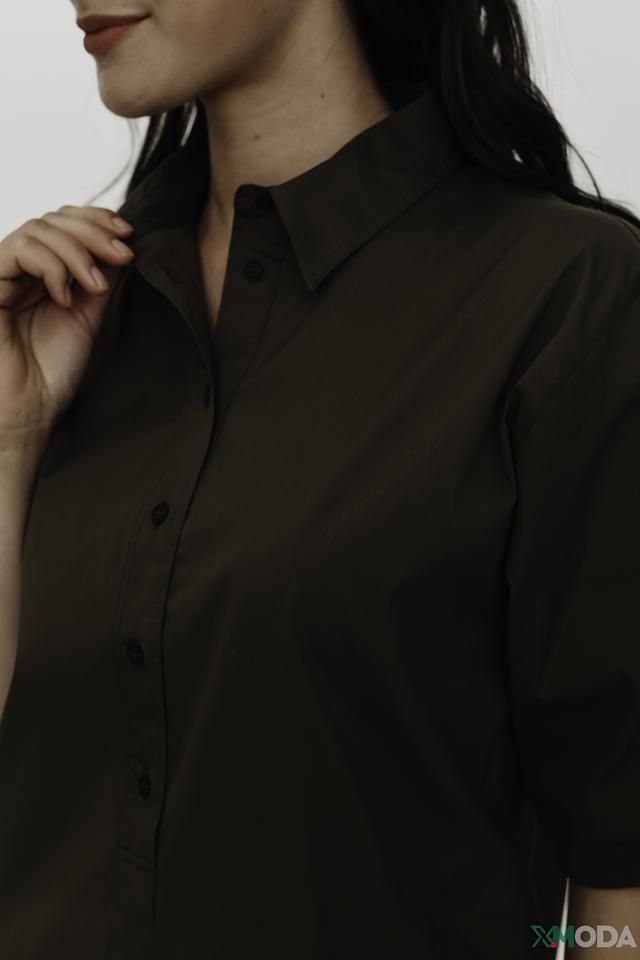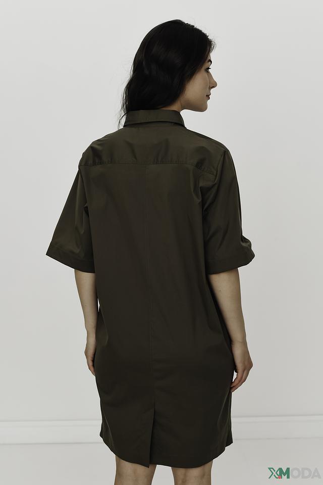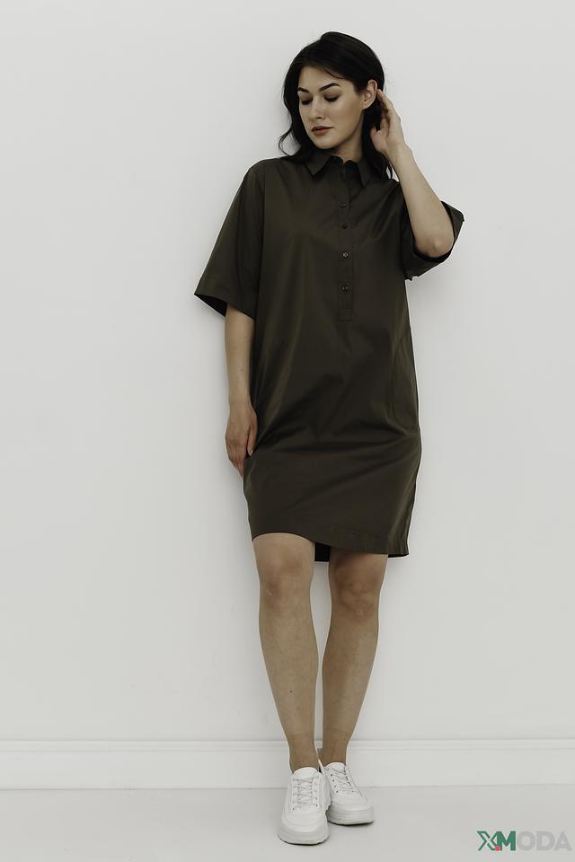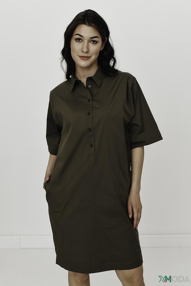 Это платье рубашка от бренда Mos Mosh выполнено в спокойном цвете хаки. Модель имеет прямой силуэт, короткие рукава и воротник рубашечного типа. Застёжка выполнена на пуговицах по всей длине платья.