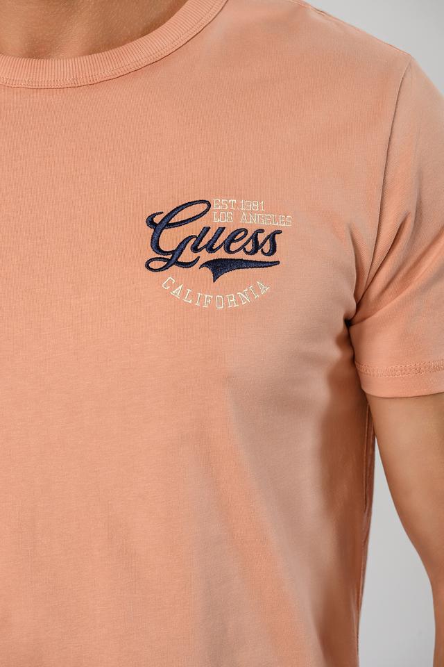Мужская футболка Guess розового цвета с логотипом бренда на груди и эффектным принтом на спине. Изготовлена из 100% хлопка, обеспечивающего комфорт в носке. Состав: хлопок 100%