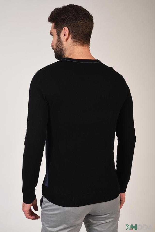 Мужской джемпер Pezzo синего и черного цвета с контрастными вставками на плечах и рукавах. Изготовлен из мягкого трикотажа, обеспечивающего комфорт и удобство в носке. Состав: вискоза 55%, шерсть 23%, полиамид 22%