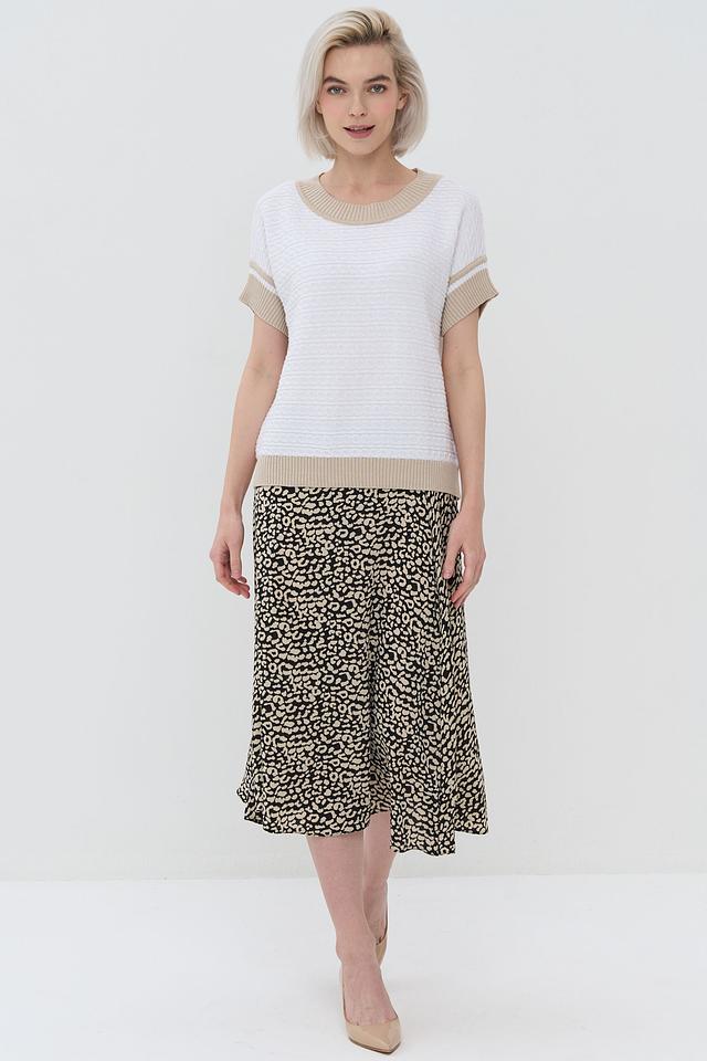 Белый джемпер NEWVAY с коротким рукавом и бежевой полоской на горловине и рукавах. Модель выполнена из мягкого и приятного к телу трикотажа, идеально подходит для создания повседневных образов. Состав: хлопок 50%, пан 50%