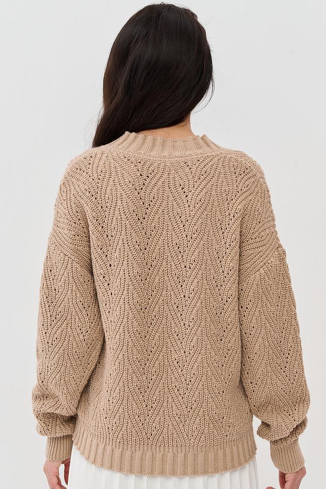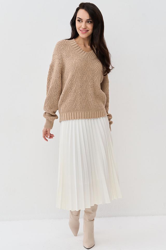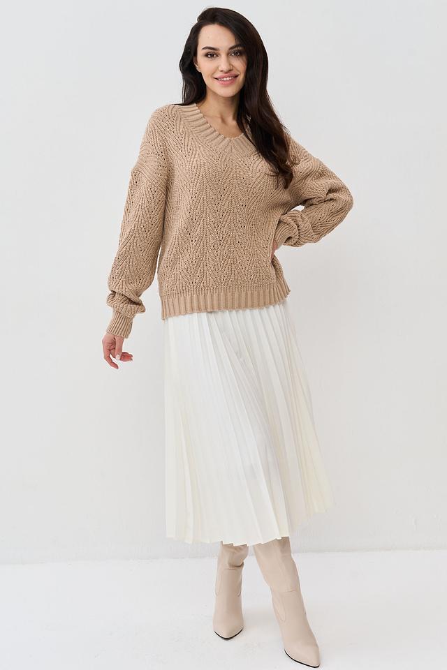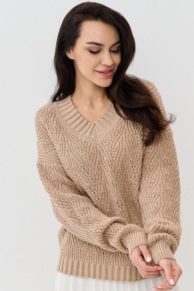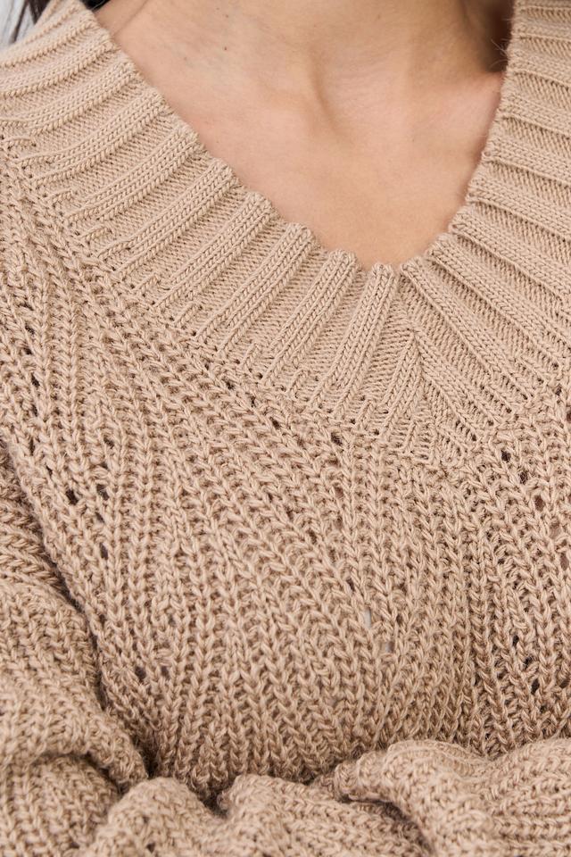 Бежевый джемпер NEWVAY из мягкого трикотажа с V-образным вырезом и выразительной фактурой вязки. Модель свободного кроя с объемными рукавами станет отличным дополнением к вашему гардеробу. Состав: пан 70%, шерсть 30%