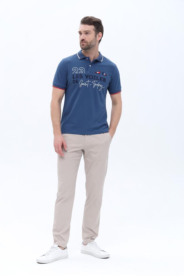 Мужское поло от бренда North Sails выполнено в насыщенном синем цвете и украшено оригинальным принтом с надписью "23 LES VOILES DE Saint-Tropez" и изображением флагов. Эта модель станет отличным дополнением к вашему гардеробу, подчеркнув вашу любовь к морской тематике и активному образу жизни.