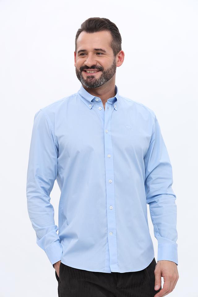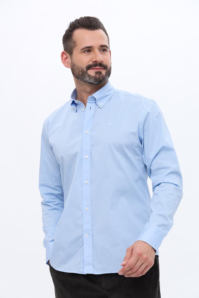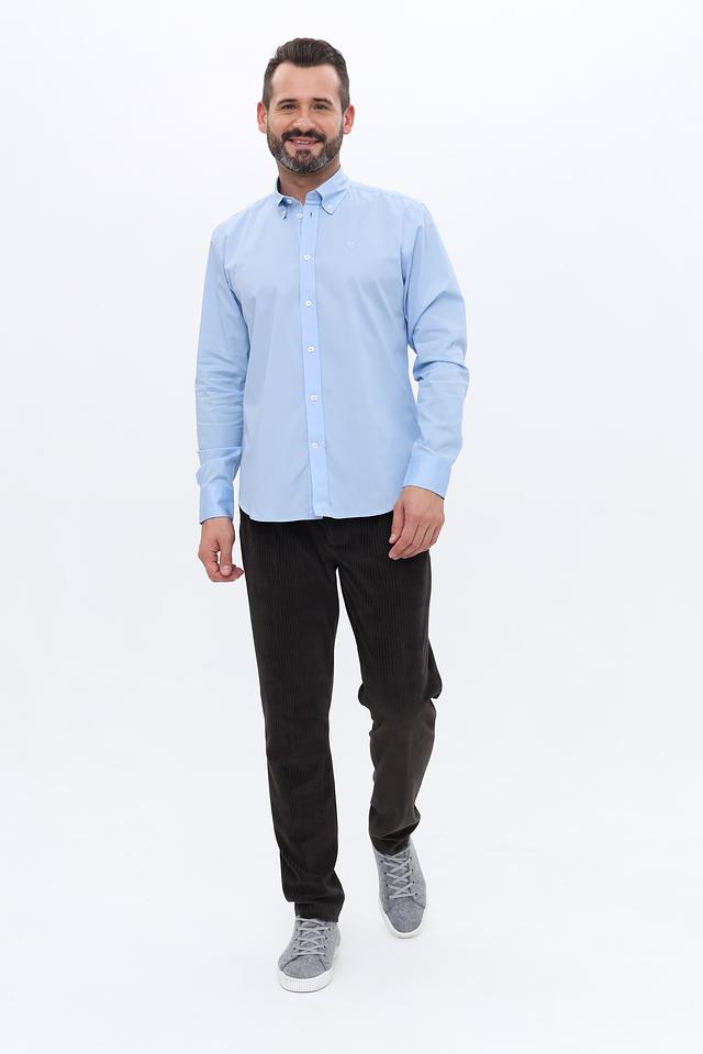 Рубашка имеет классический крой с длинными рукавами и воротником button-down. Изготовлена из качественного хлопка (97%) с добавлением эластана (3%), что обеспечивает комфорт при носке и сохранение формы.