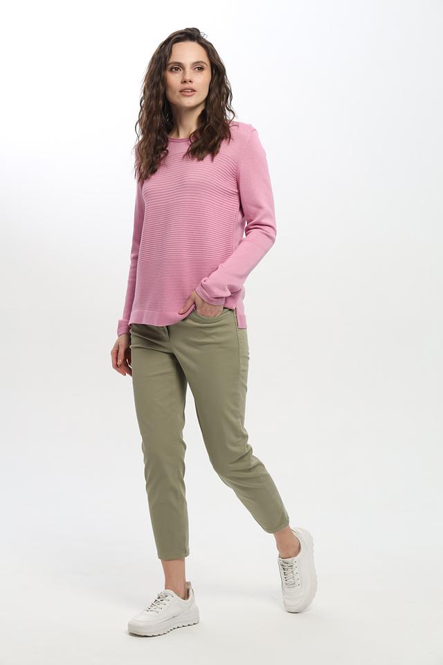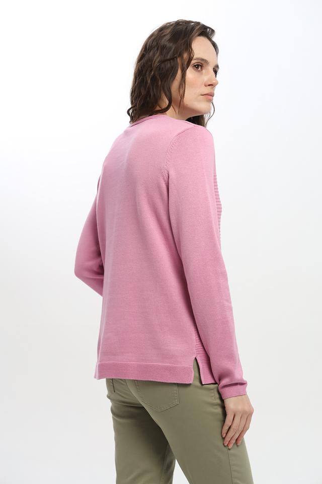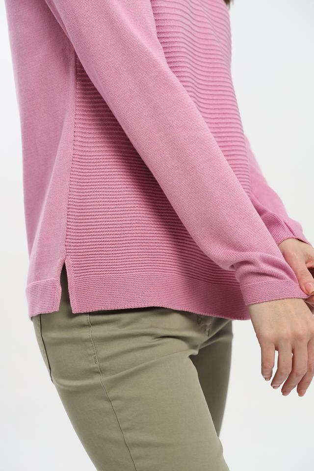 Джемпер имеет нежный розовый цвет и текстурную вязку, которая придает ему особый шарм. Круглый вырез горловины и длинные рукава делают его универсальным для различных образов.
