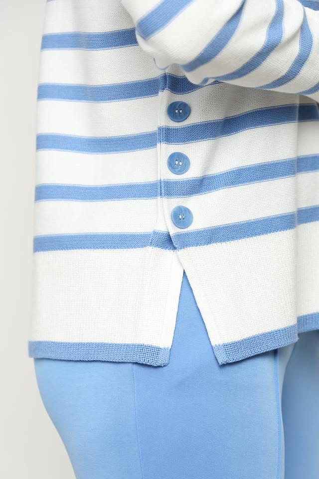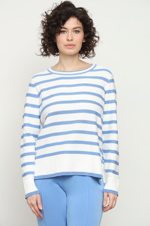 Женский пуловер Olsen голубого и белого цвета в классическую полоску. Изготовлен из мягкого и приятного к телу сочетания хлопка и полиакрила, имеет удобный крой и деликатную отделку в виде пуговиц. Состав: хлопок 50%, полиакрил 50%
