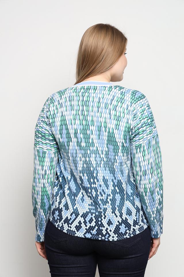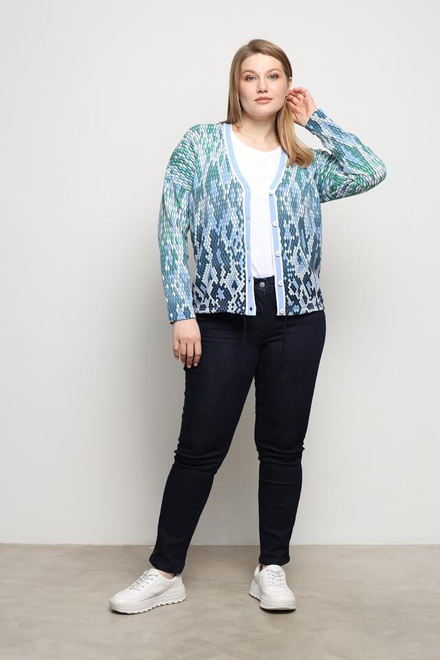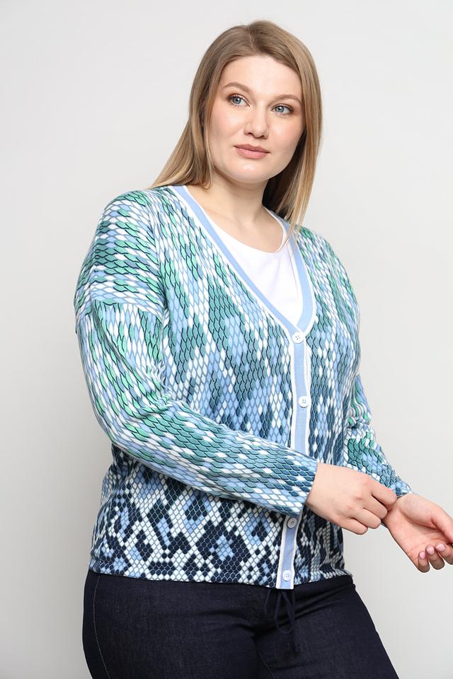 Кардиган имеет V-образный вырез и застегивается на ряд пуговиц. Его отличает яркий и запоминающийся узор, сочетающий в себе различные оттенки голубого и зеленого цветов. Такой принт добавит образу оригинальности и свежести.