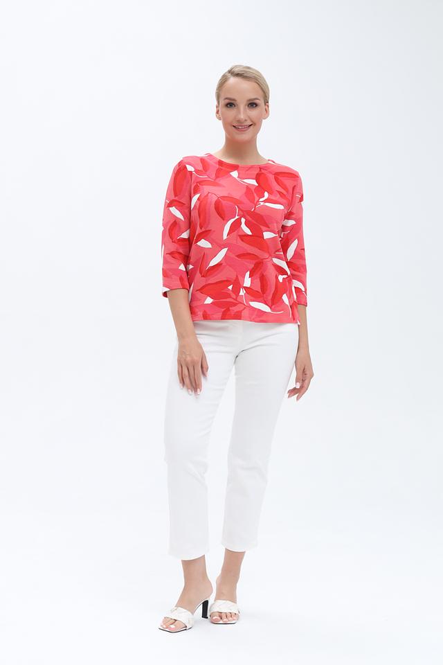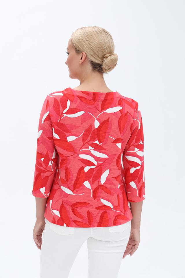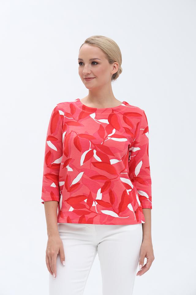 Этот женский пуловер от бренда Olsen выполнен в ярком коралловом цвете и украшен оригинальным цветочным принтом. Модель имеет округлый вырез горловины и удобный рукав три четверти, что делает его универсальным для различных образов.