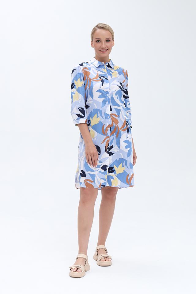 Платье имеет прямой силуэт, воротник рубашка и рукава три четверти. Застежка на пуговицах по всей длине платья. Яркий цветочный принт добавляет образу женственности и легкости.