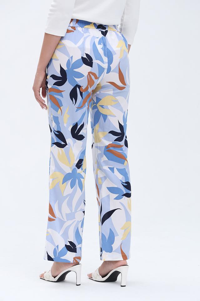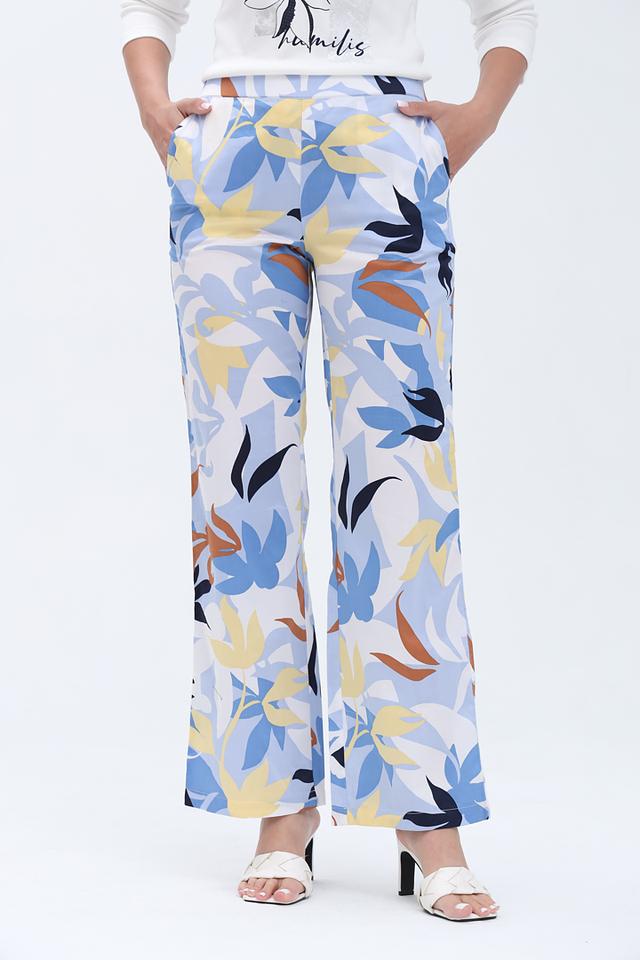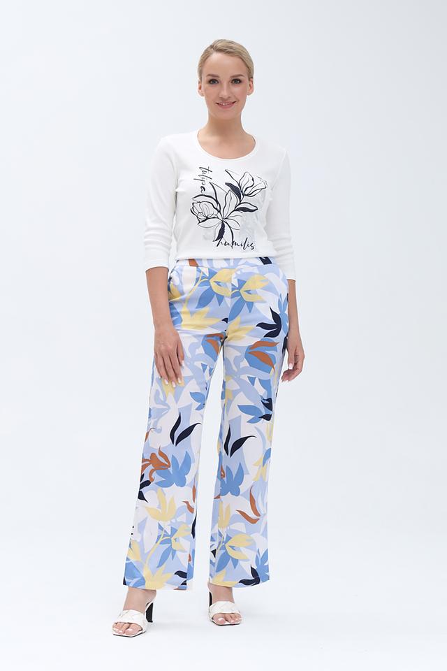 Особенностью модели является оригинальный цветочный принт, сочетающий в себе оттенки голубого, жёлтого и коричневого. Прямой крой брюк обеспечивает свободу движений и подходит для различных типов фигуры.