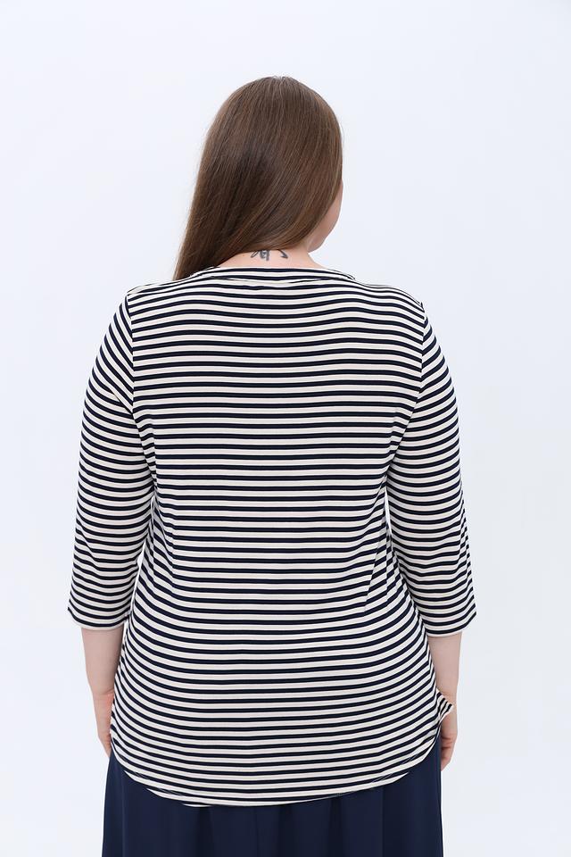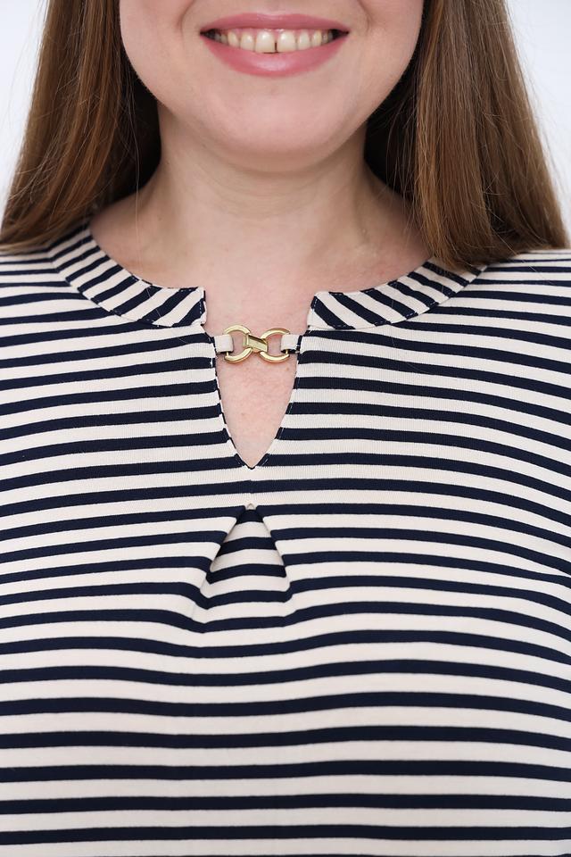 Лонгслив Olsen белого и чёрного цвета с полоской и V-образным вырезом, украшенным небольшой золотистой цепочкой. Изготовлен из мягкой вискозы с добавлением эластана для комфортной посадки и свободы движений. Состав: вискоза 97%, эластан 3%