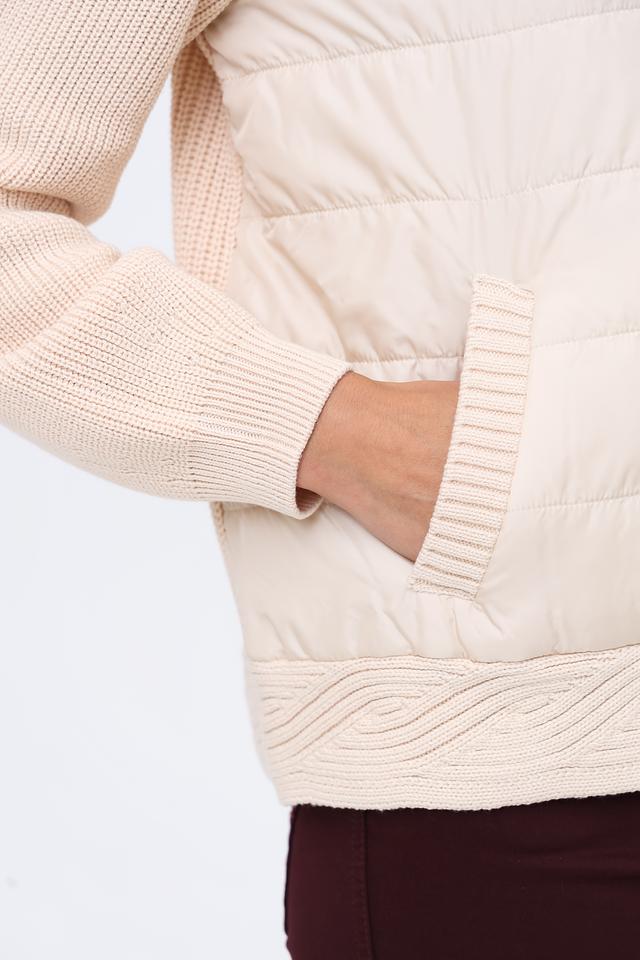 Передняя часть и спинка жакета выполнены из стеганой ткани, что придает ему объем и текстуру. Рукава выполнены из мягкого вязаного полотна, что обеспечивает комфорт и свободу движений. Застежка – молния, воротник – стойка.