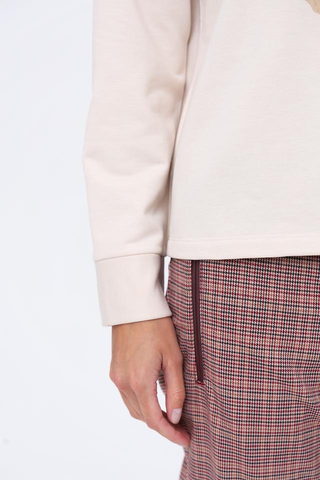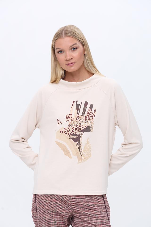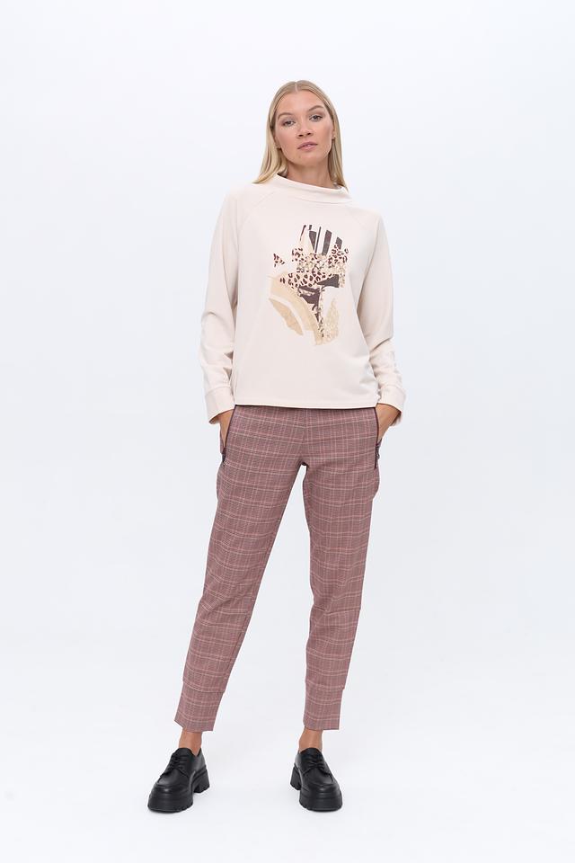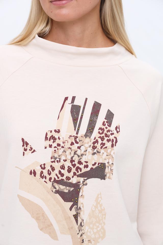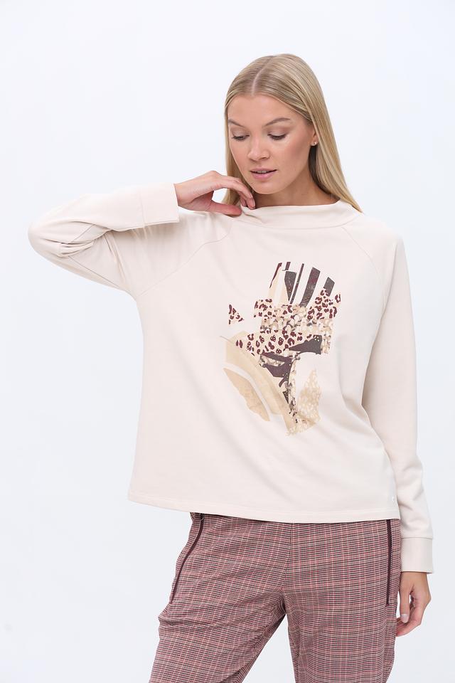 Особенностью данного пуловера является яркий принт на лицевой стороне, выполненный в абстрактной стилистике с элементами леопардового окраса. Принт выполнен в коричневых и бежевых тонах, гармонично сочетаясь с основным цветом изделия.