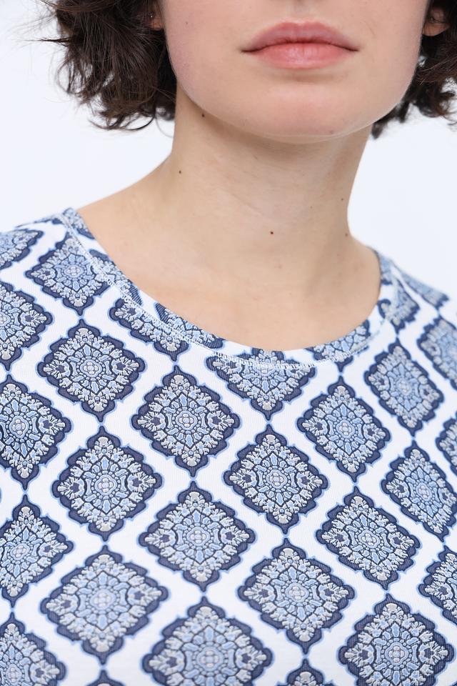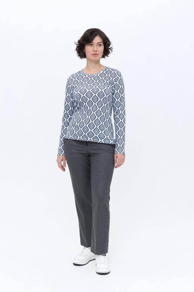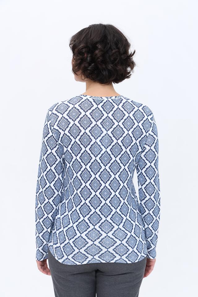 Лонгслив имеет прямой крой и круглый вырез горловины. Его особенностью является яркий геометрический принт в голубых и белых тонах, который придаёт изделию оригинальность и выразительность.