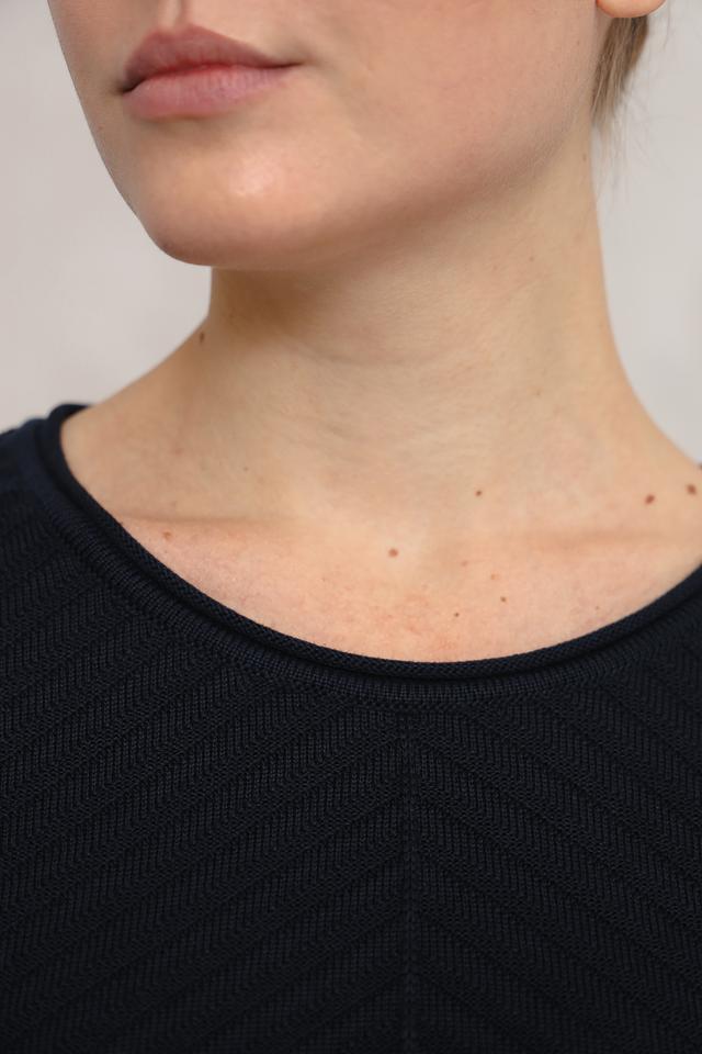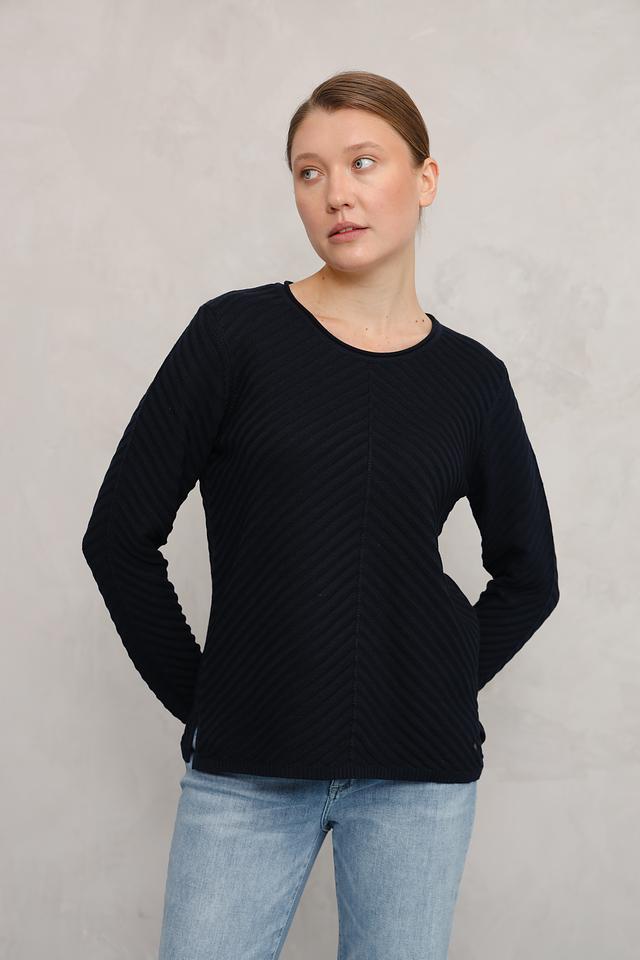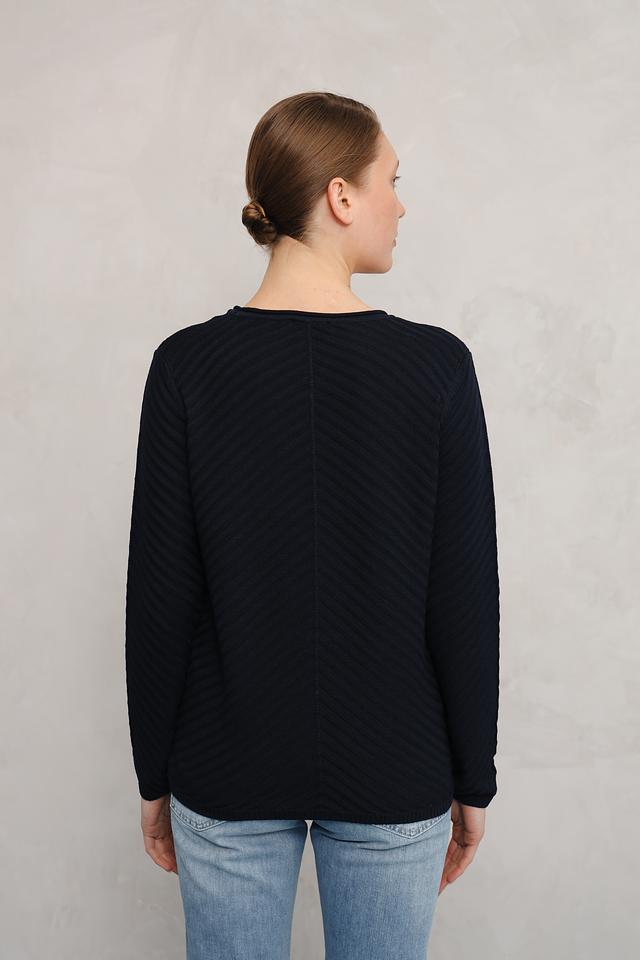 Особенностью модели является выразительная текстура, создающая визуальный интерес и добавляющая объём. Пуловер имеет круглый вырез горловины и длинные рукава, обеспечивающие тепло и уют.