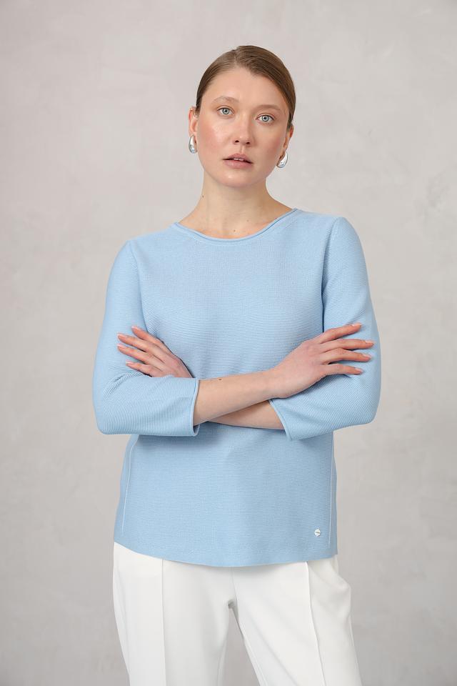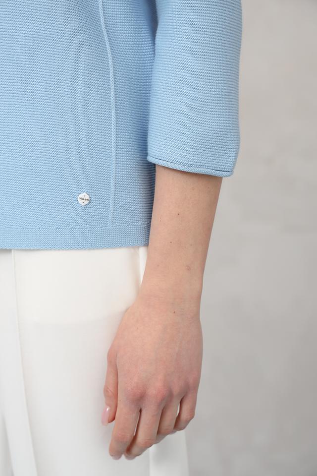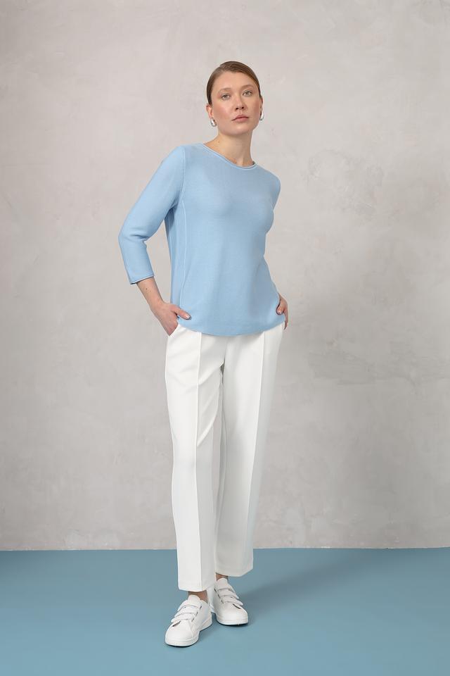 Пуловер имеет классический голубой цвет и лаконичный дизайн. Округлый вырез горловины и рукав три четверти делают его универсальным для создания различных образов. Слегка приталенный силуэт подчеркивает достоинства фигуры, не сковывая движений.