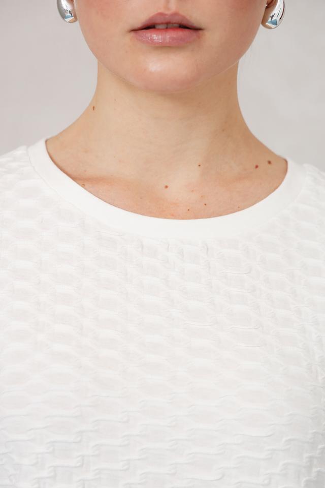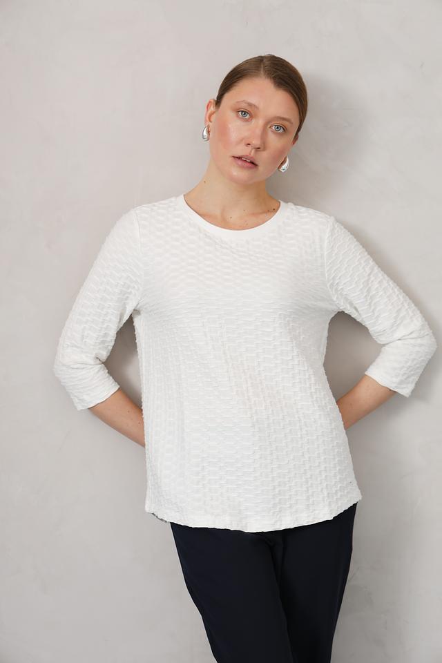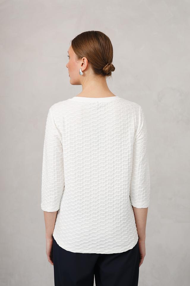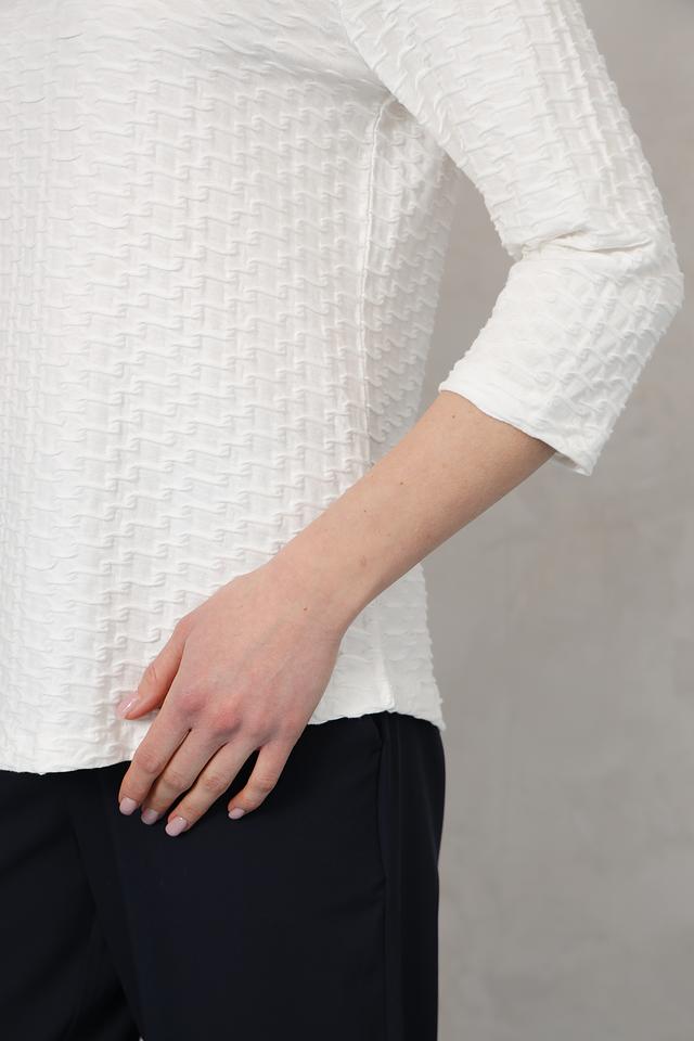 Этот стильный пуловер от Olsen выполнен в белом цвете и отличается оригинальной текстурой, создающей объёмный эффект. Модель имеет круглый вырез горловины и рукава длиной три четверти, что делает её универсальной для различных образов.