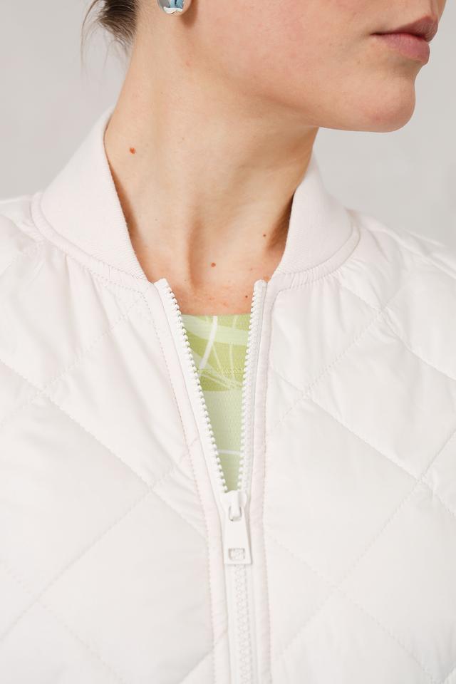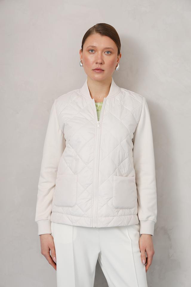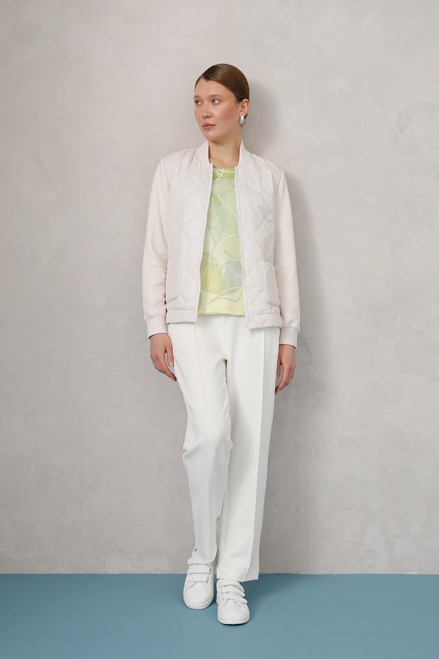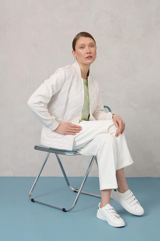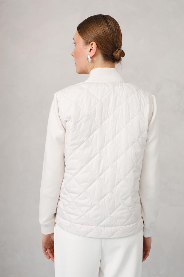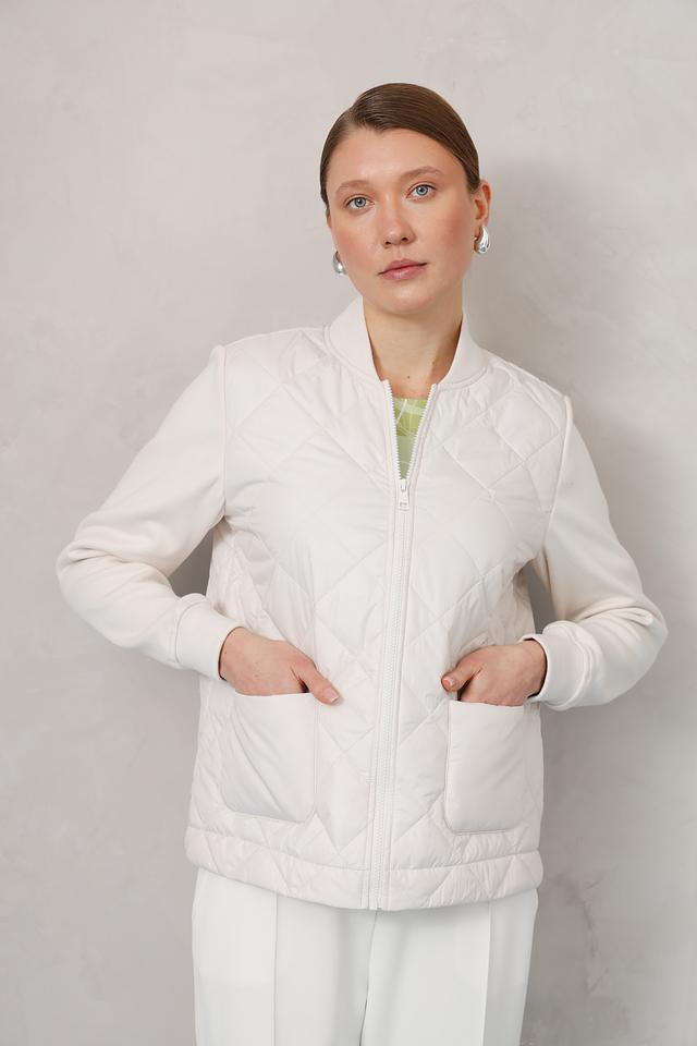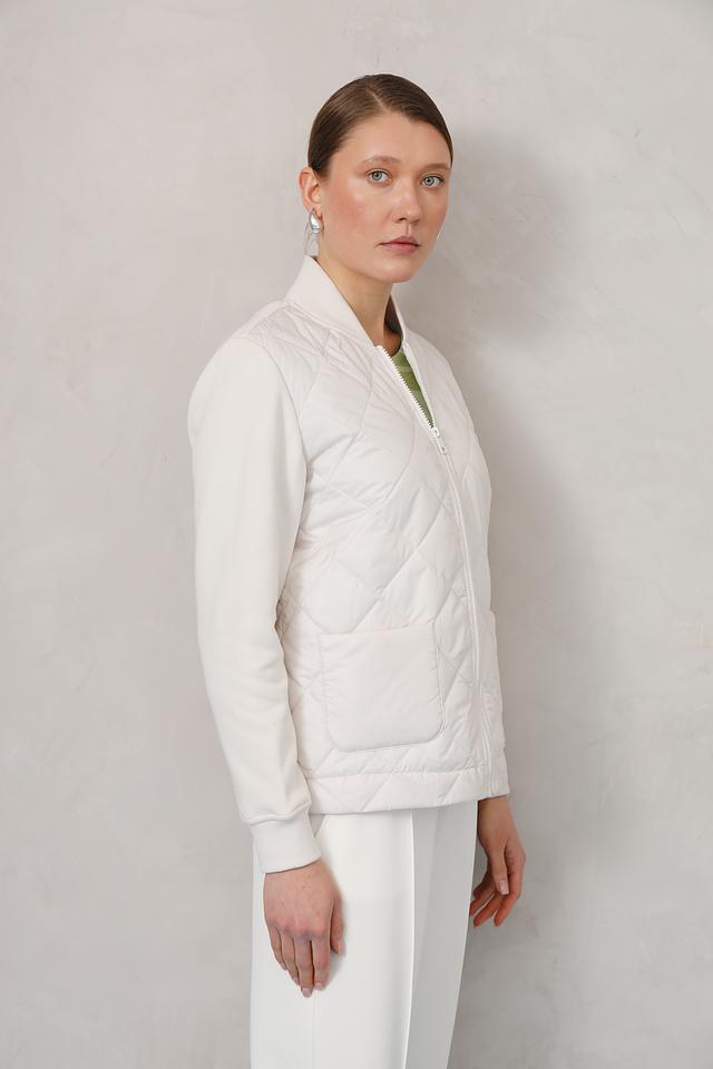 Жакет имеет стеганую фактуру, которая придает ему особый шарм и визуальный объем. Модель застегивается на молнию, имеет воротник-стойку и два функциональных кармана. Крой жакета обеспечивает комфортную посадку по фигуре, не сковывая движений.