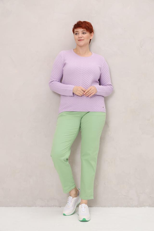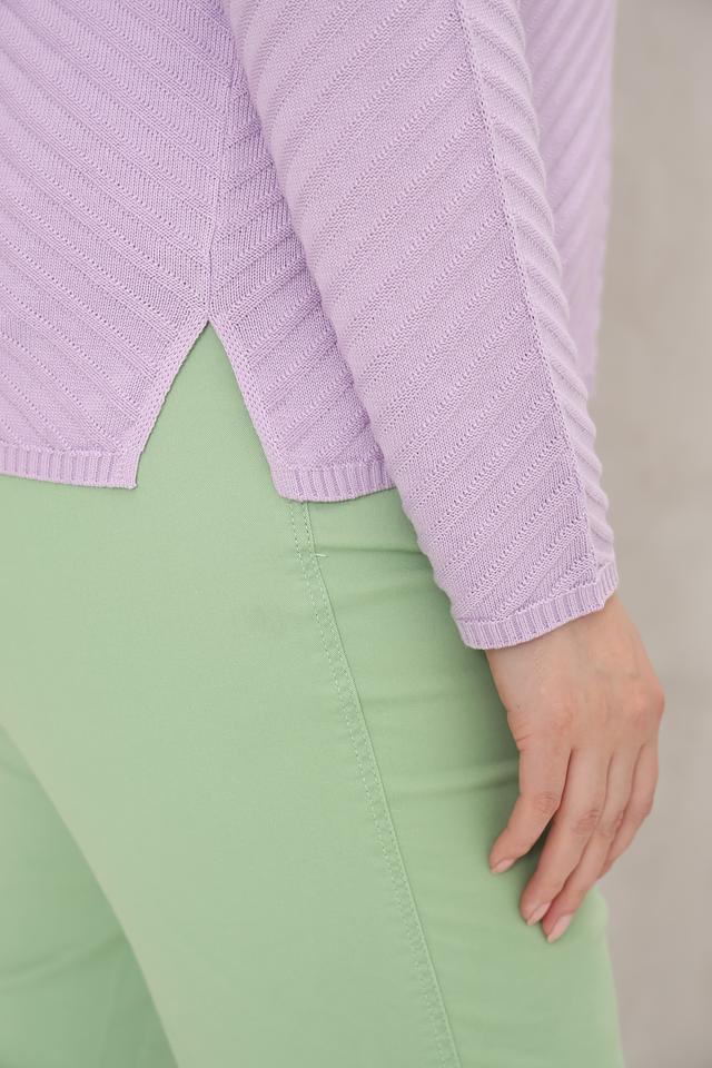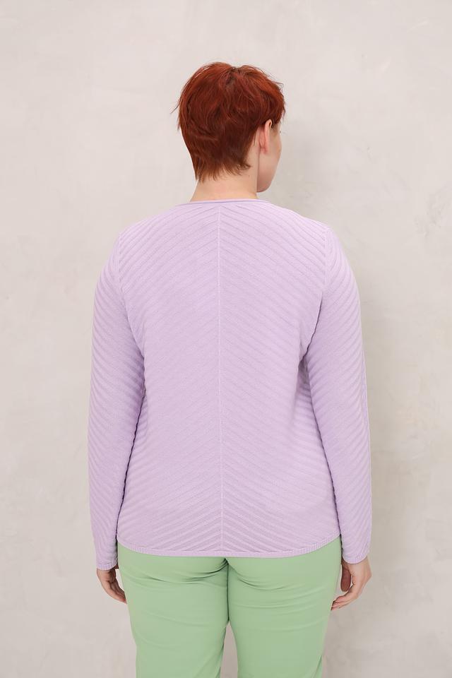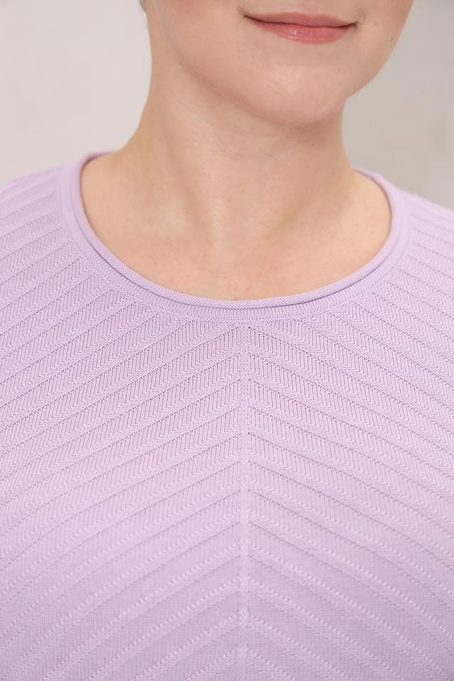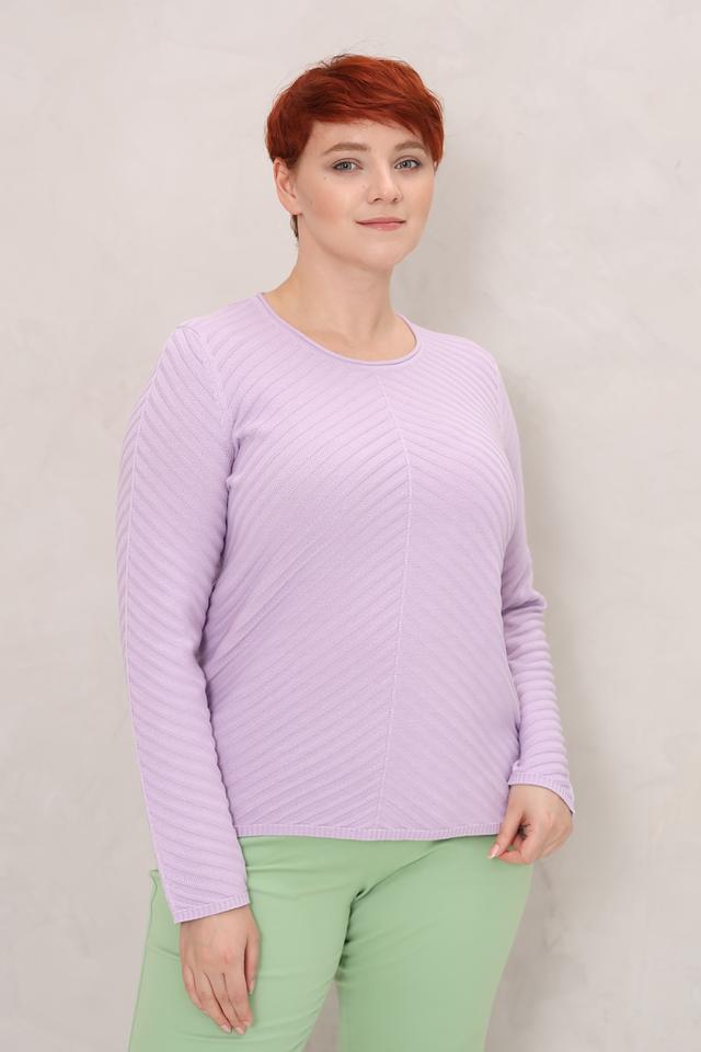 Пуловер имеет лавандовый цвет и украшен оригинальным геометрическим узором, который придает ему особый шарм. Классический круглый вырез горловины и длинные рукава делают его универсальным для различных образов.
