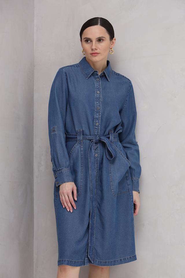 Платье рубашка от Olsen выполнено в денимовом стиле голубого цвета. Модель с длинным рукавом и поясом, завязывающимся на талии, подчеркнет фигуру и создаст стильный образ. Состав: лиоцел 100%