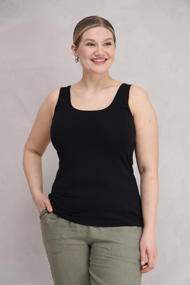 Топ имеет классический крой с широкими бретелями и округлым вырезом горловины. Благодаря простому и лаконичному дизайну, он легко сочетается с различными элементами одежды, позволяя создавать разнообразные образы.