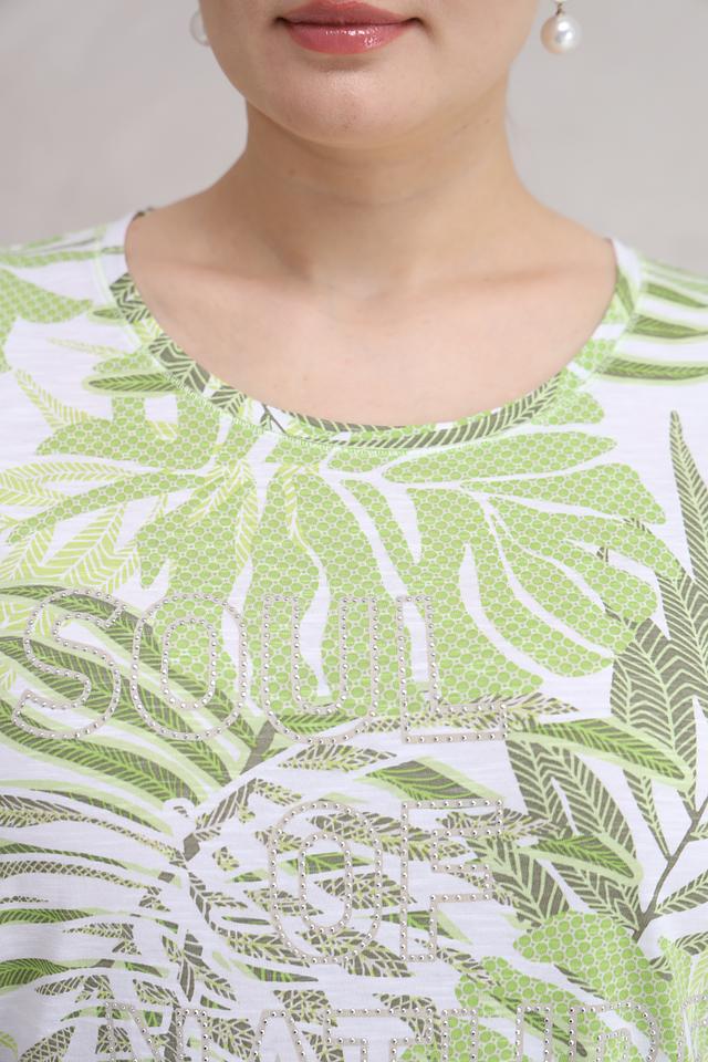 Блуза имеет свободный крой и короткие рукава, что обеспечивает свободу движений в жаркую погоду. Особенностью модели является яркий принт с изображением тропических листьев в оттенках зеленого и белого. Завязка на талии позволяет подчеркнуть фигуру и создать более женственный силуэт.