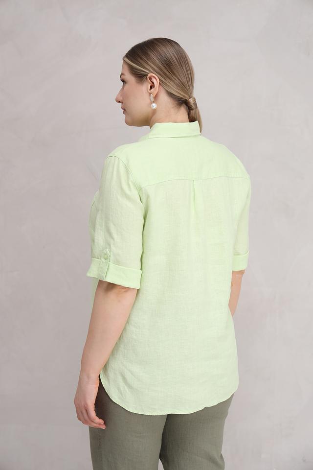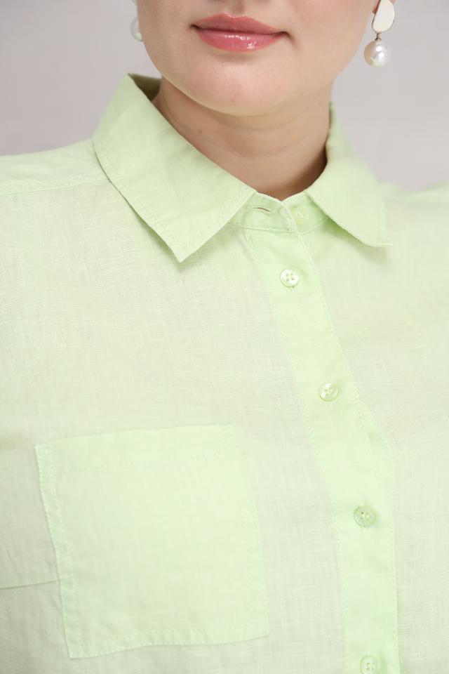 Цвет рубашки – нежный оттенок лайма, который освежает образ и легко сочетается с другими элементами гардероба. Эта рубашка станет отличным дополнением к вашему летнему образу, будь то повседневный наряд или более элегантный стиль.