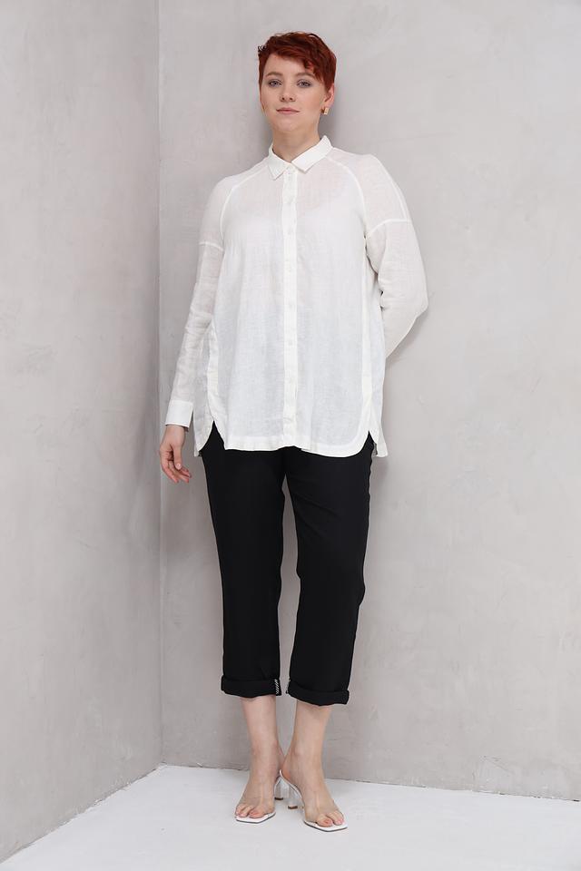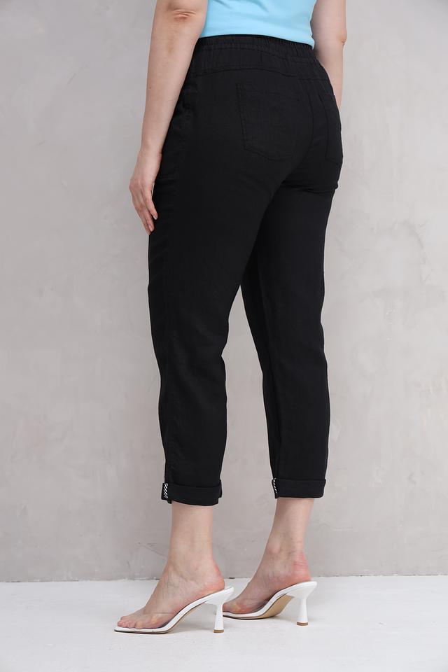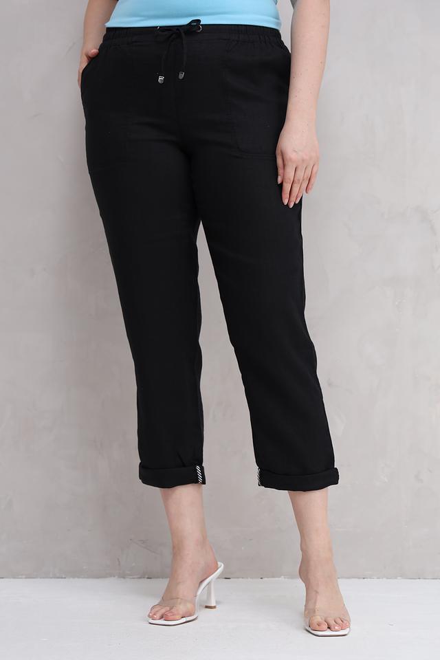 Брюки изготовлены из 100% льна, что делает их дышащими и приятными к телу. Эластичный пояс с кулиской обеспечивает идеальную посадку по фигуре, а манжеты внизу добавляют образу непринужденности.